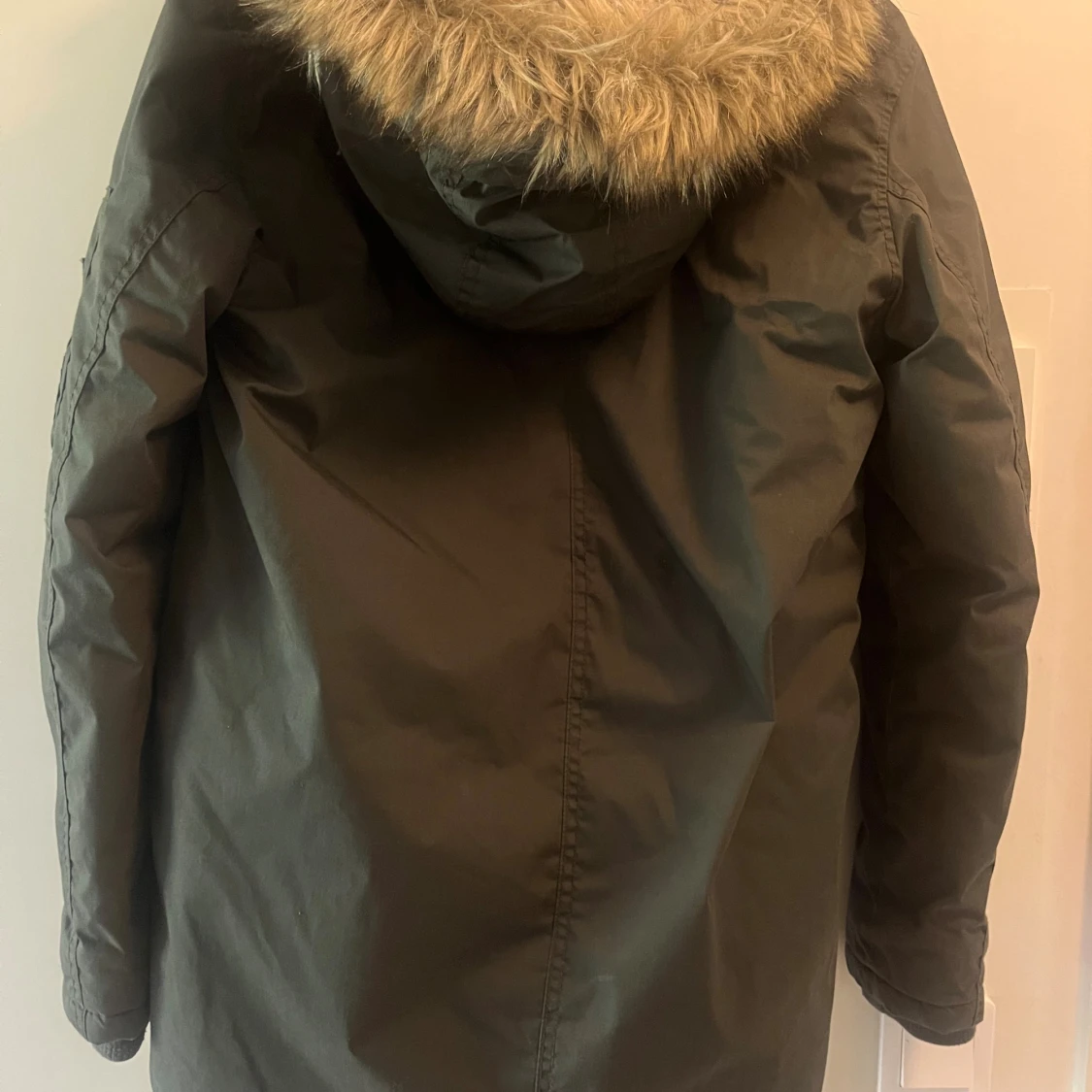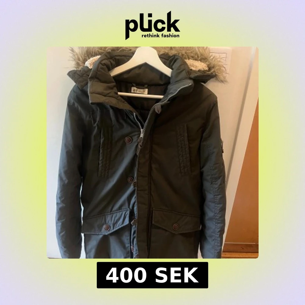 Parkajacka från H&M i mörkgrönt med huva och fuskpäls. Jackan har både dragkedja och knappar framtill, stora fickor och långa ärmar. Fint skick