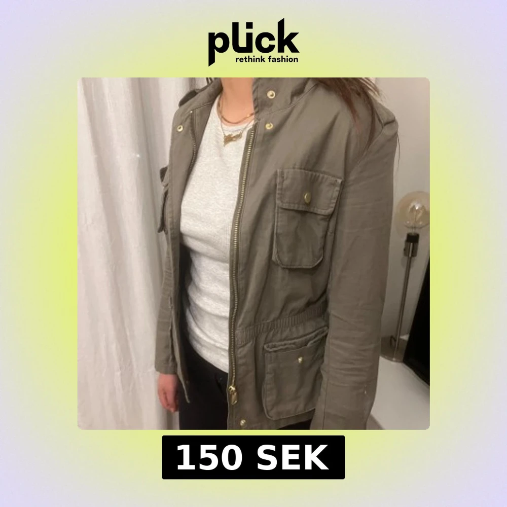 Snygg grön parkajacka med dragkedja och flera praktiska fickor. Jackan har långa ärmar och en stilren design med knappar i guldton. Perfekt för vår och höst.