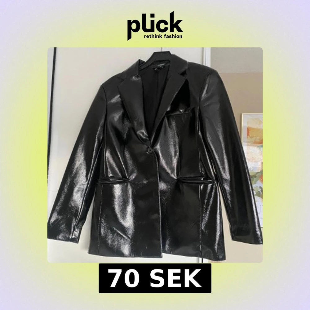 Snygg svart kavaj med glansig finish och klassisk krage. Den har en enkel knäppning framtill och två fickor. Perfekt för en stilren look. Är oanvänd. Hör av er om ni vill att jag skickar mer bilder🥰