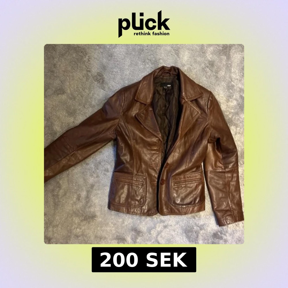 Snygg brun skinnjacka från H&M för kanske 20+ år sedan som jag fick av min mamma med klassisk krage och tre stora knappar framtill. Jackan har markerade sömmar, två fickor med detaljerade kanter och en figurnära passform. Perfekt för dig som vill ha en tidlös och cool look.