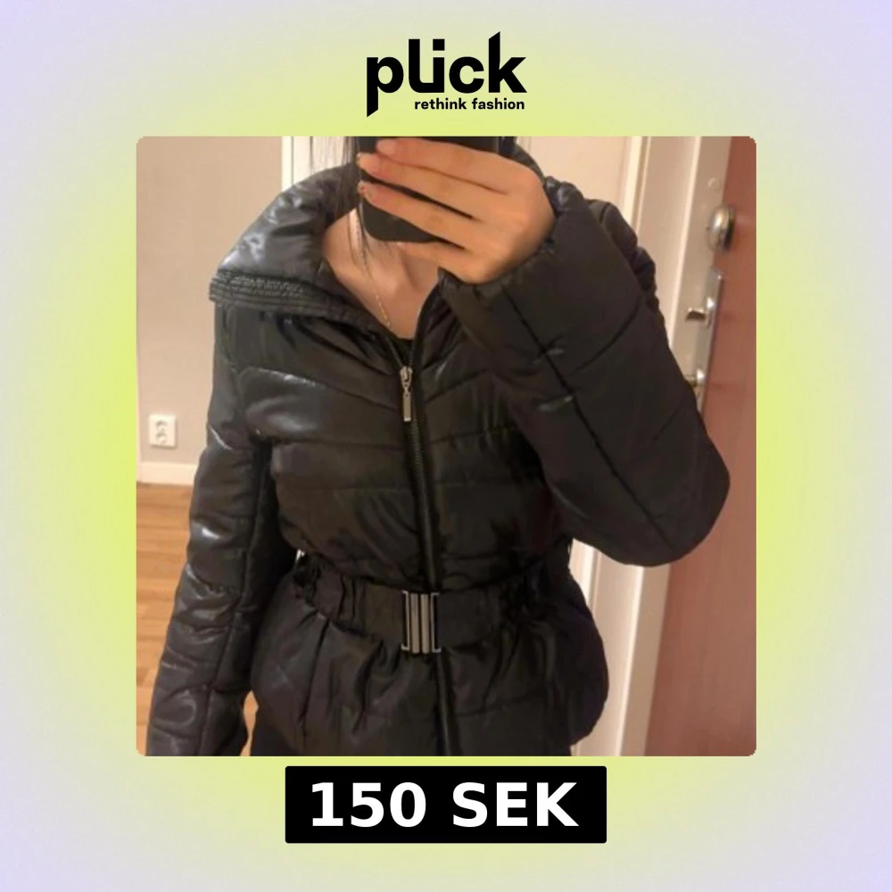 Snygg svart pufferjacka från H&M i storlek 36. Jackan har en glansig finish, hög krage och markerad midja med ett brett bälte och metallspänne. Perfekt för kalla dagar