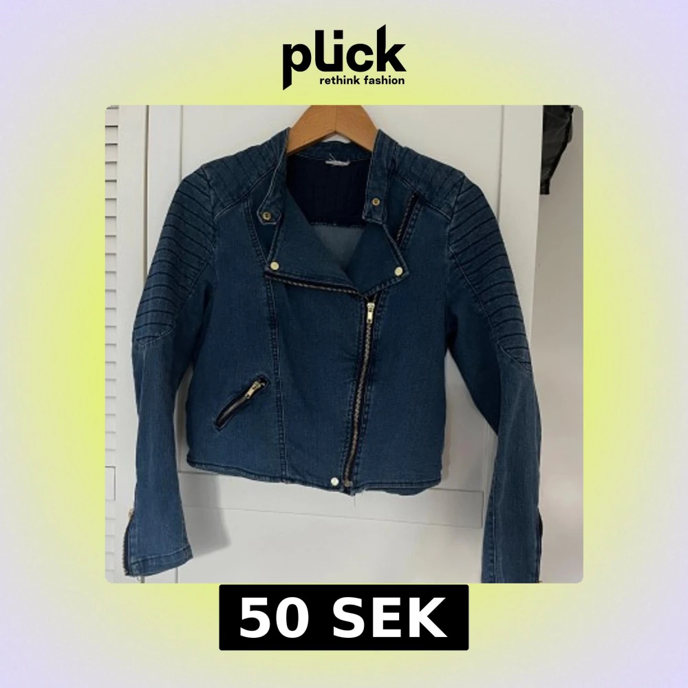 Snygg mörkblå jeansjacka i bikerstil med markerade axlar och ärmar, guldfärgade dragkedjor och detaljer. Jackan har croppad passform och coola sömmar på axlarna för extra edge.