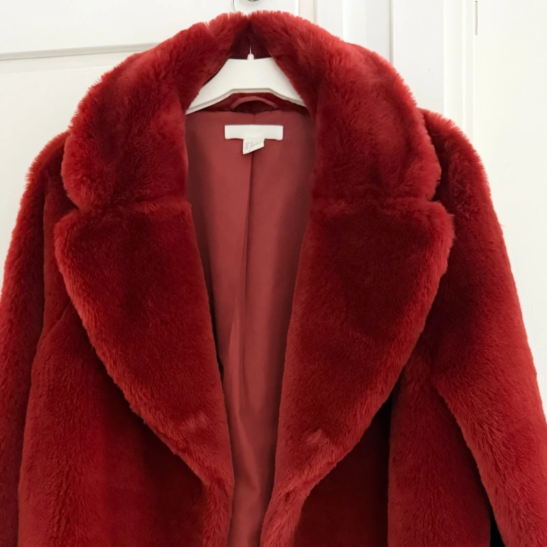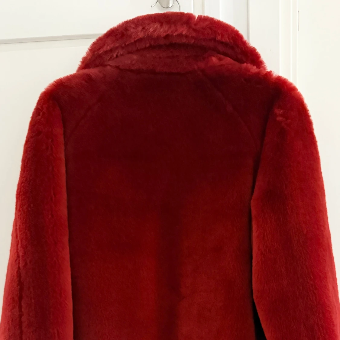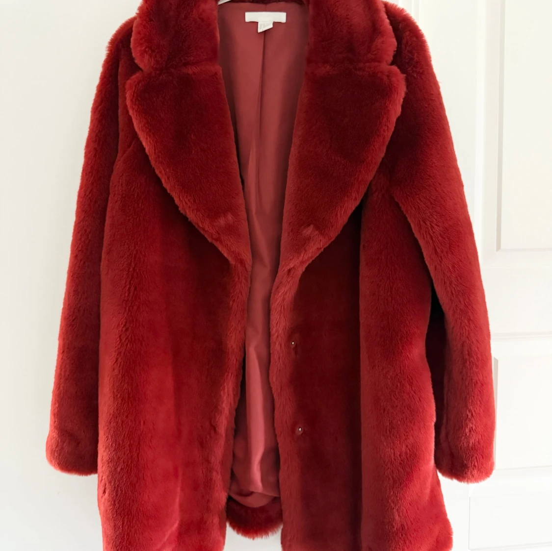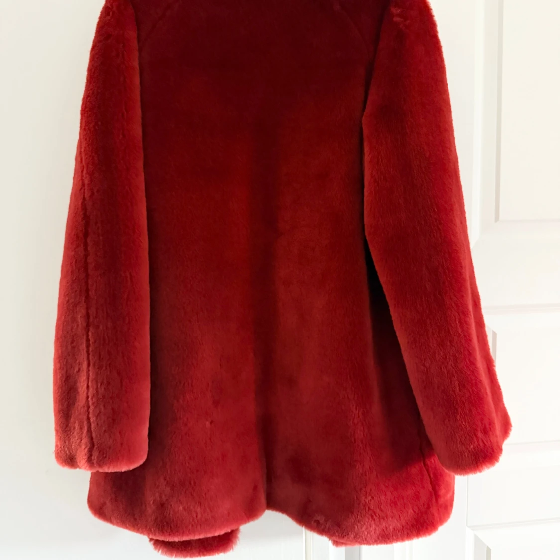 Säljer en fluffig roströd pälsjacka med bred krage och helröd insida. Den är tillverkad i mjukt fuskpälsmaterial och har knäppning framtill. Aldrig använd.