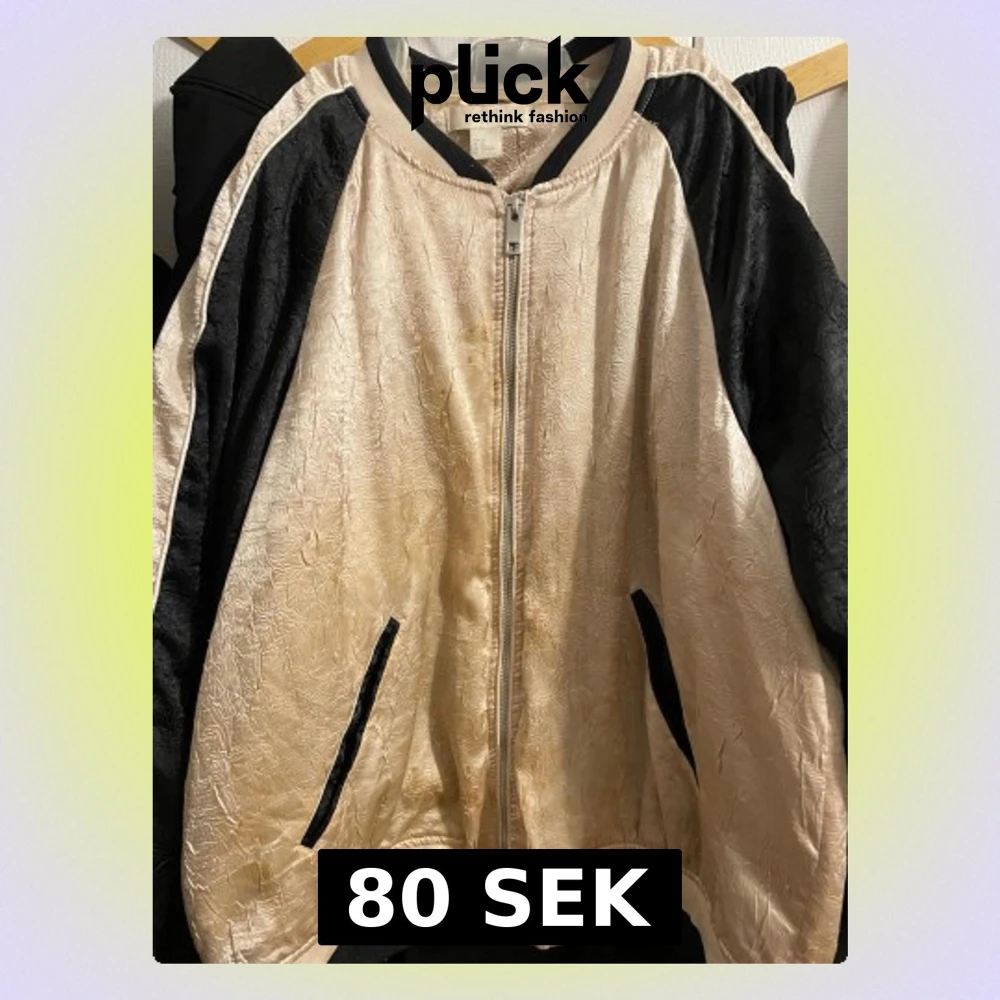 Säljer en beige och svart bomberjacka från H&M med coolt strukturerat tyg och kontrastpaneler på ärmarna. Jackan har dragkedja framtill, svarta fickor och ribbade muddar. Perfekt för dig som vill sticka ut med en unik look.