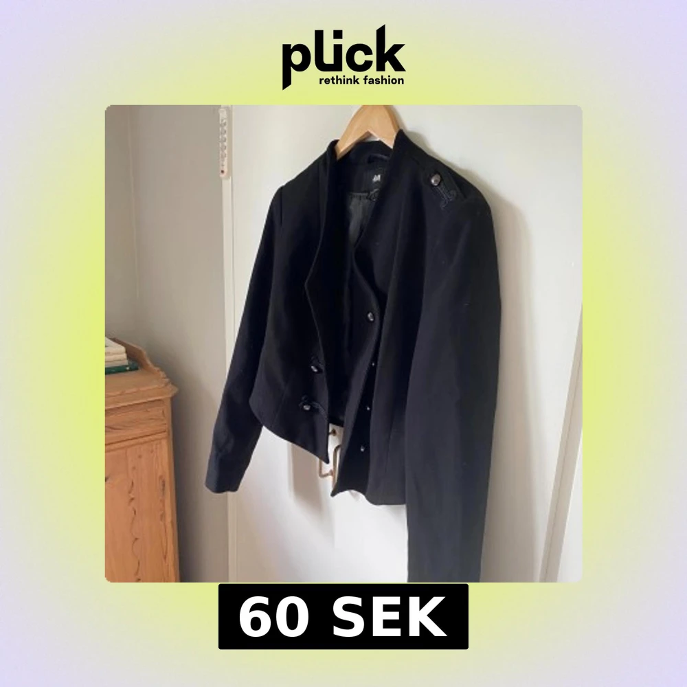 Säljer en svart kavajjacka från H&M med militärinspirerade detaljer och dekorativa knappar framtill. Jackan är croppad, har axelklaffar och lång ärm. Perfekt för dig som vill ha en stilren och edgy look. Någon knapp lite lös