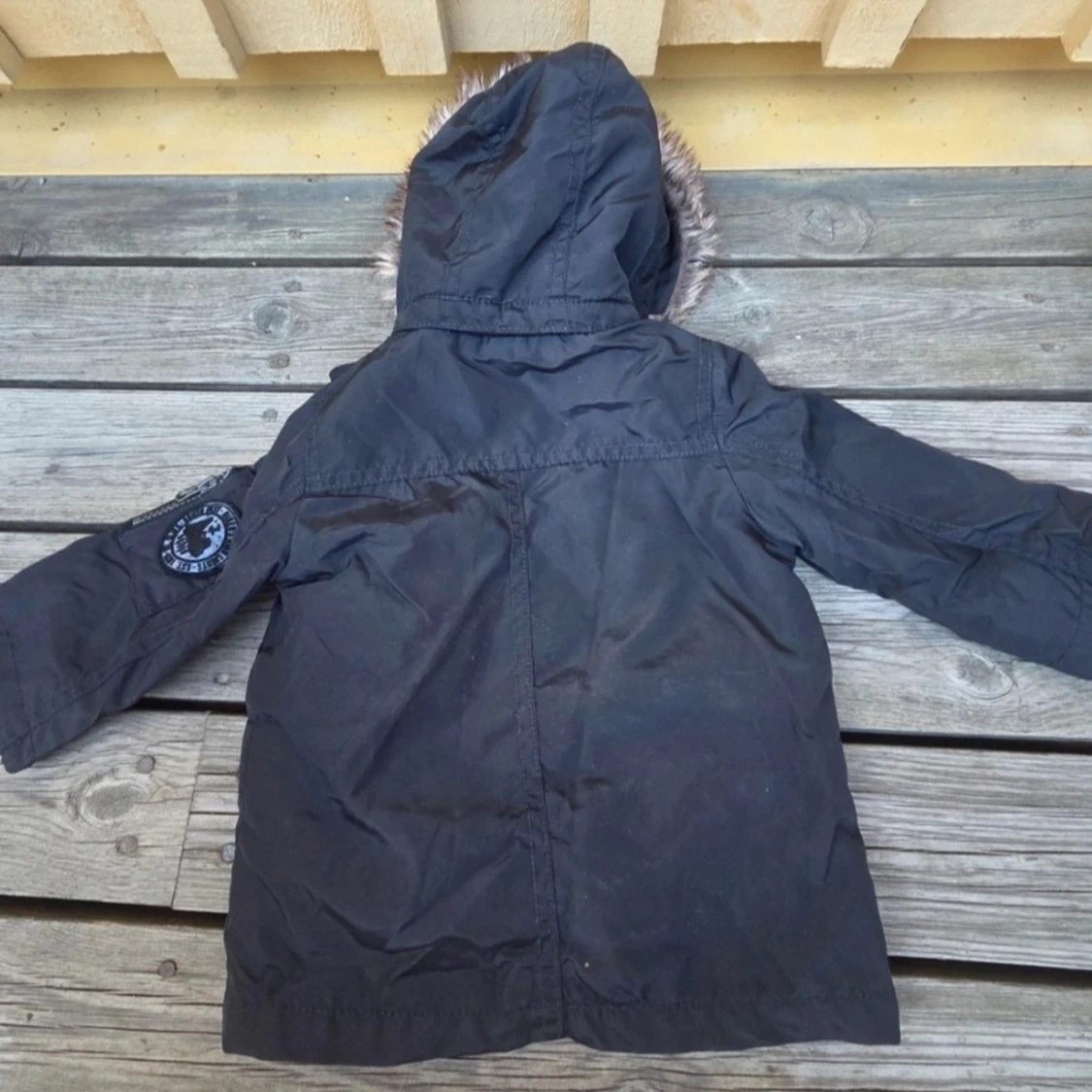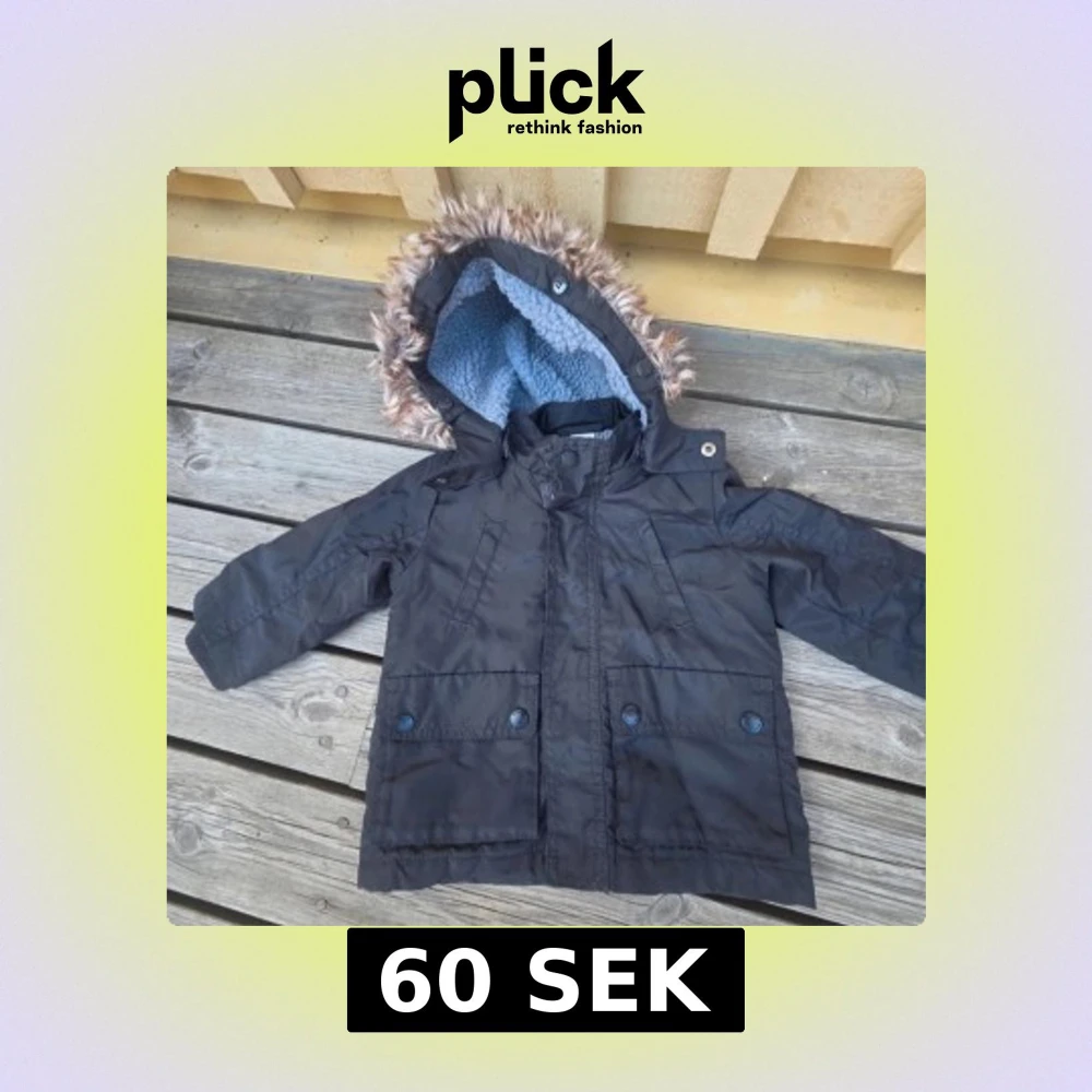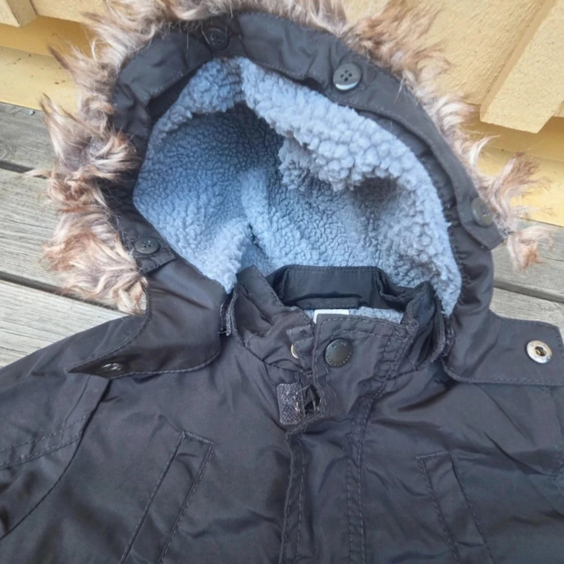 Svart parkajacka med mysig blå teddyfoder på insidan och huva med fuskpäls. Jackan har stora fickor med knappar framtill och en patch på ena ärmen. Perfekt för kalla dagar och har en klassisk, stilren look.