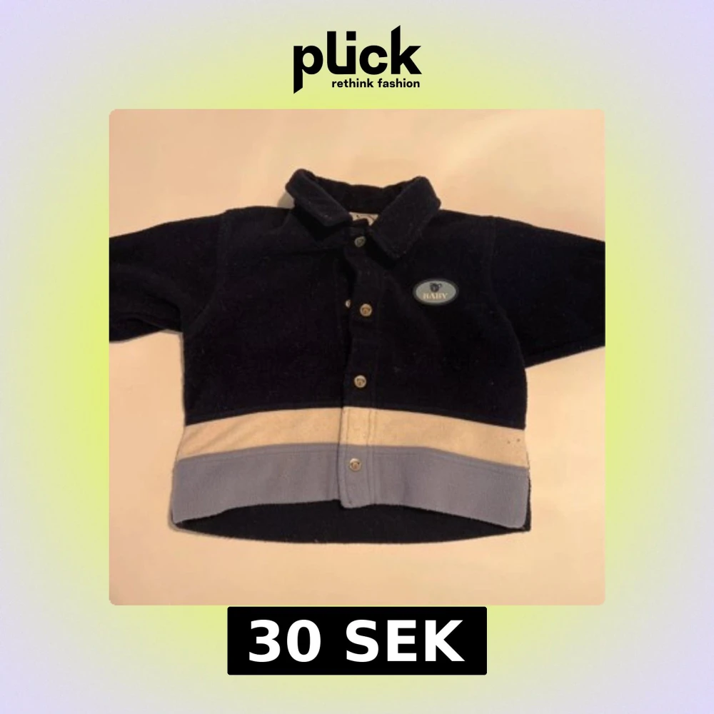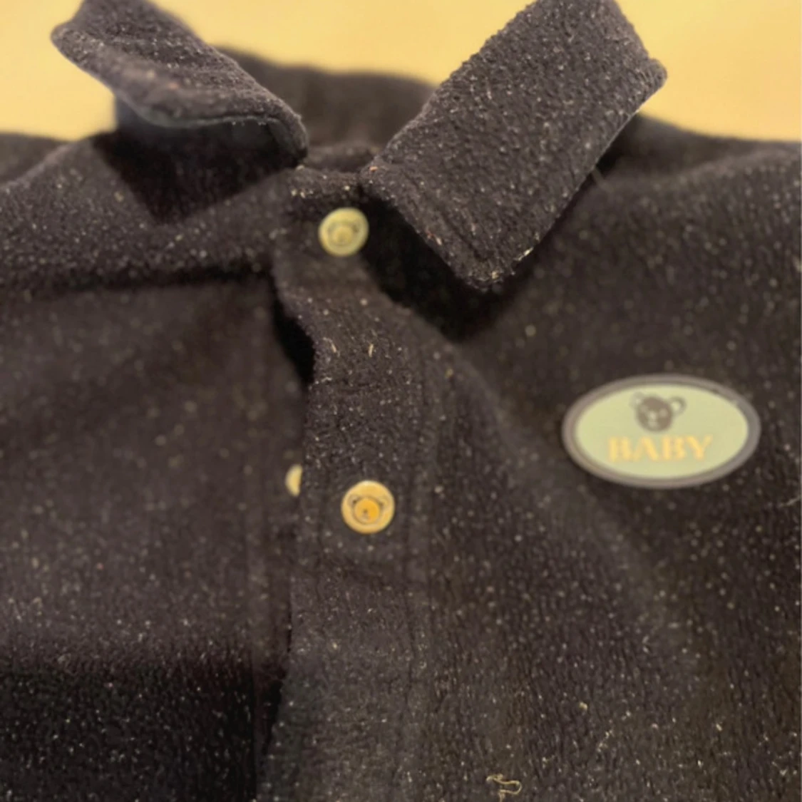Mysig mörkblå fleecejacka från H&M Baby med krage och knappar framtill. Jackan har en beige och ljusblå rand längst ner och ett litet Baby-märke på bröstet. Perfekt för kyliga dagar och enkel att ta på.
