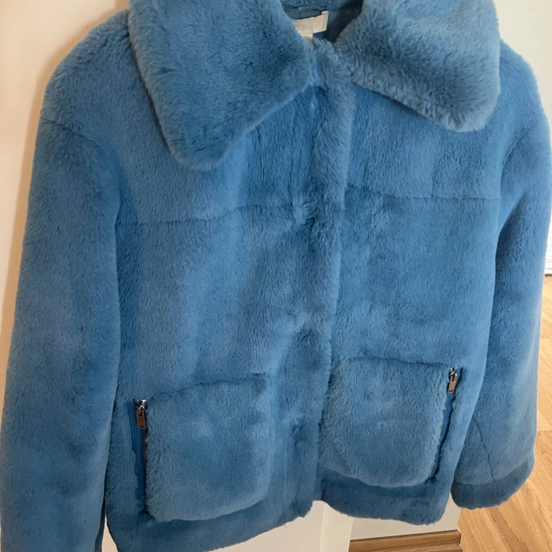 Säljer en supermjuk och fluffig blå pälsjacka i storlek S. Den har en klassisk krage och två fickor med dragkedjor framtill. Perfekt för att hålla sig varm och stilren under kyliga dagar. Jackan är i bra skick och redo för en ny ägare!