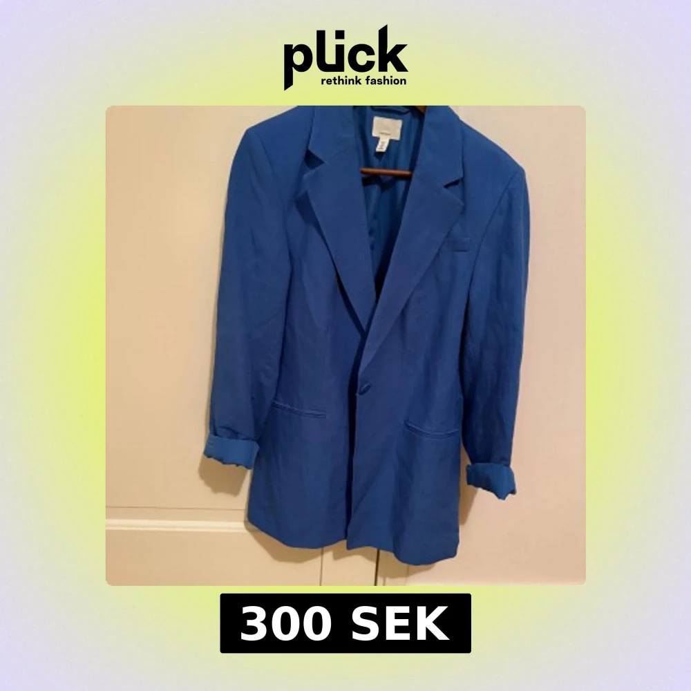Snygg blå kavaj från H&M i linneblandning. Kavajen har en klassisk design med långa ärmar och knäppning fram. Perfekt för en stilren look. Använd två ggr. Nypris ca 500kr