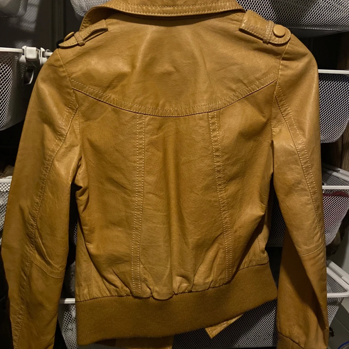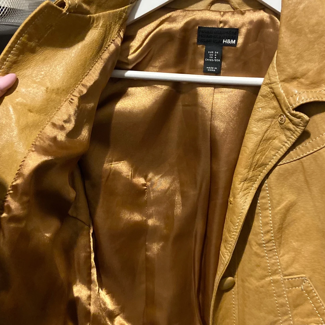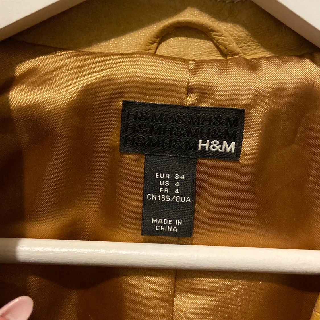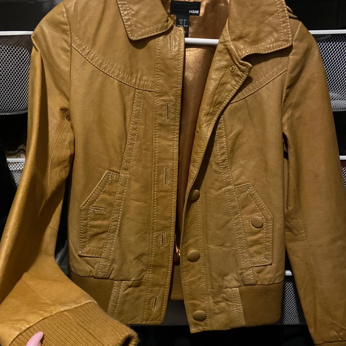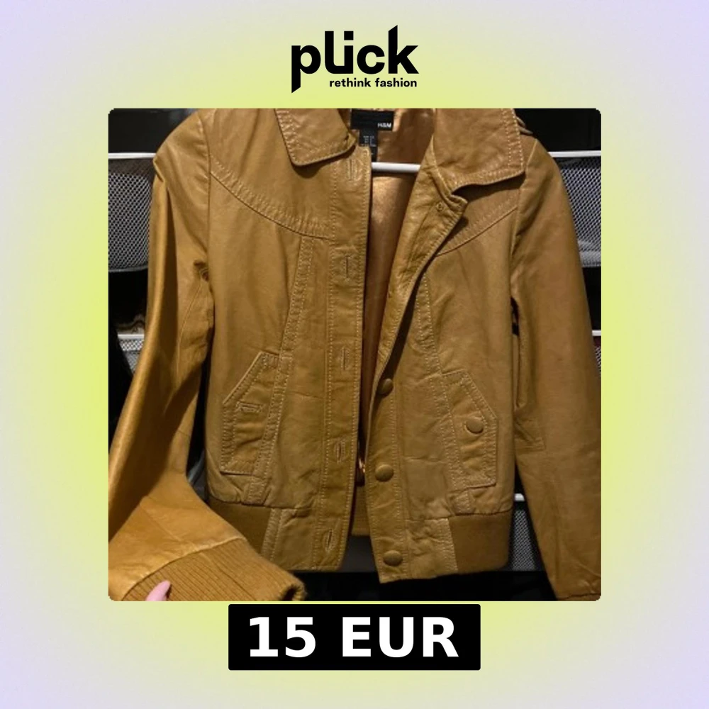 Snygg brun skinnjacka från H&M med klassisk krage och knappar framtill. Jackan har långa ärmar och ribbade muddar vid ärmslut och nederkant. Perfekt för höst och vår!