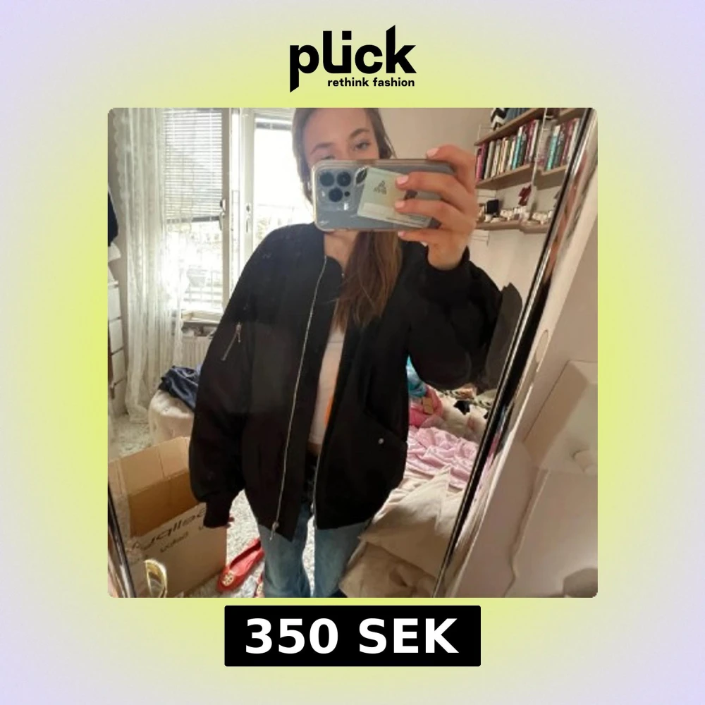 Säljer en svart oversized bomberjacka med klassisk siluett, ribbade muddar och silverfärgad dragkedja från hm. Jackan har fickor med tryckknappar och en extra ficka med dragkedja på ärmen. Passar även mig som bär storlek S!🌸