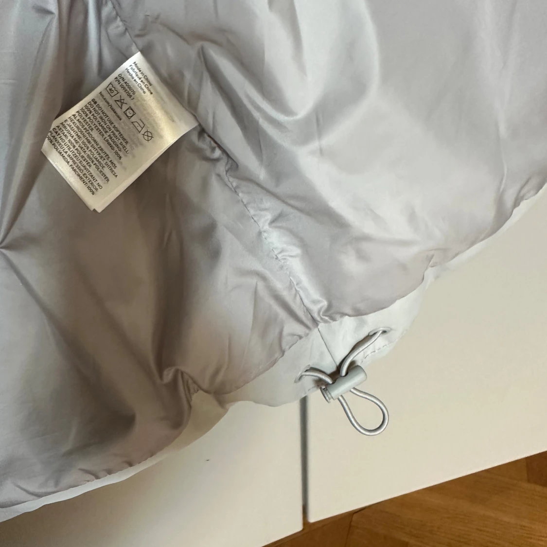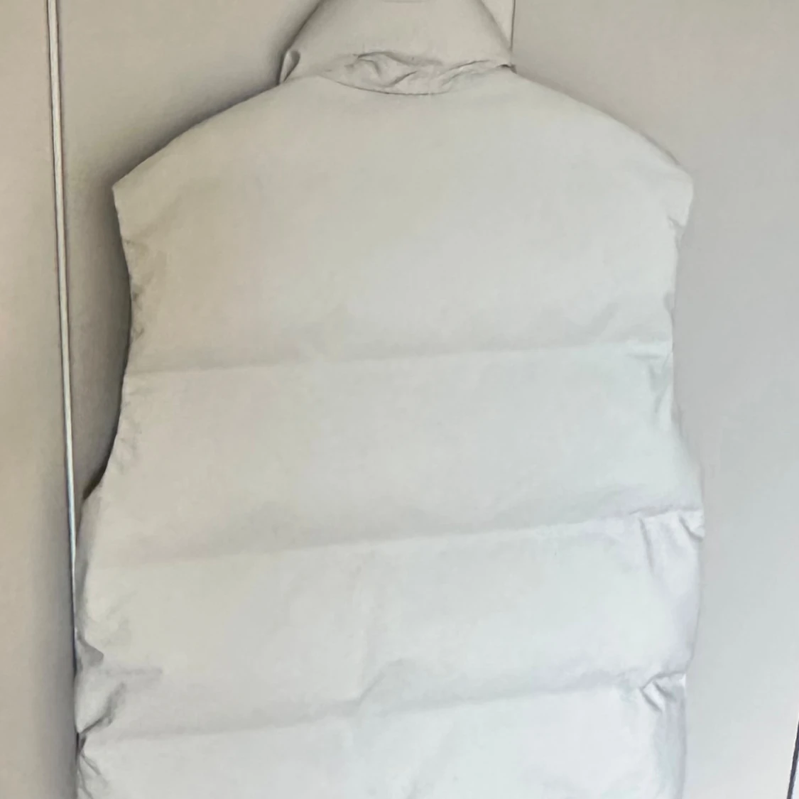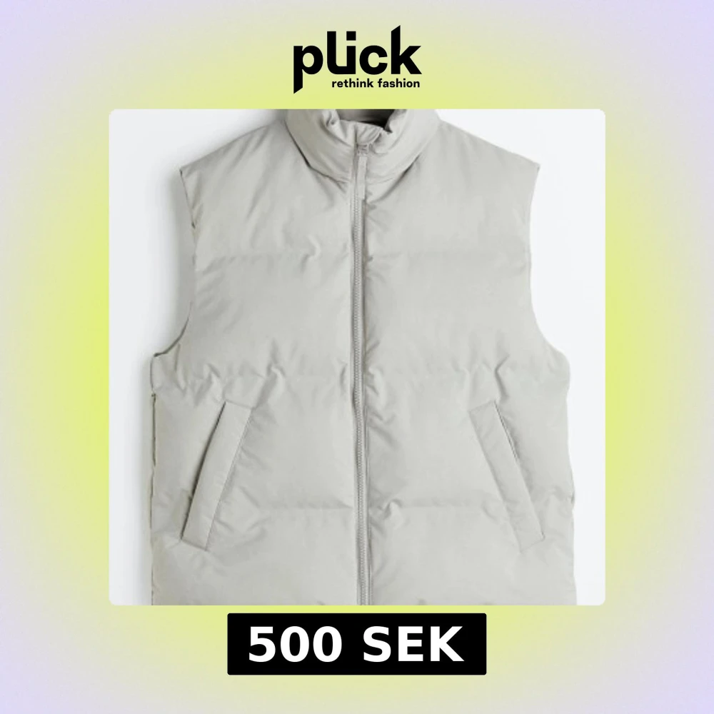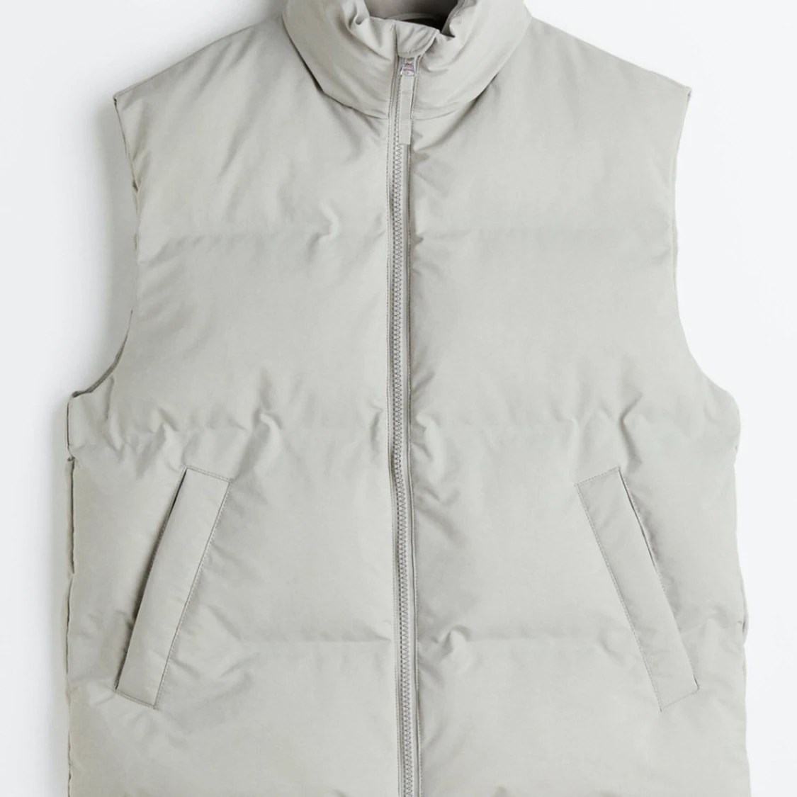 Snygg beige dunväst från H&M i storlek L. Västen har hög krage, dragkedja framtill och två snedställda fickor. Materialet är både vattenavvisande och vindtät. Perfekt för lager-på-lager under kyliga dagar.
