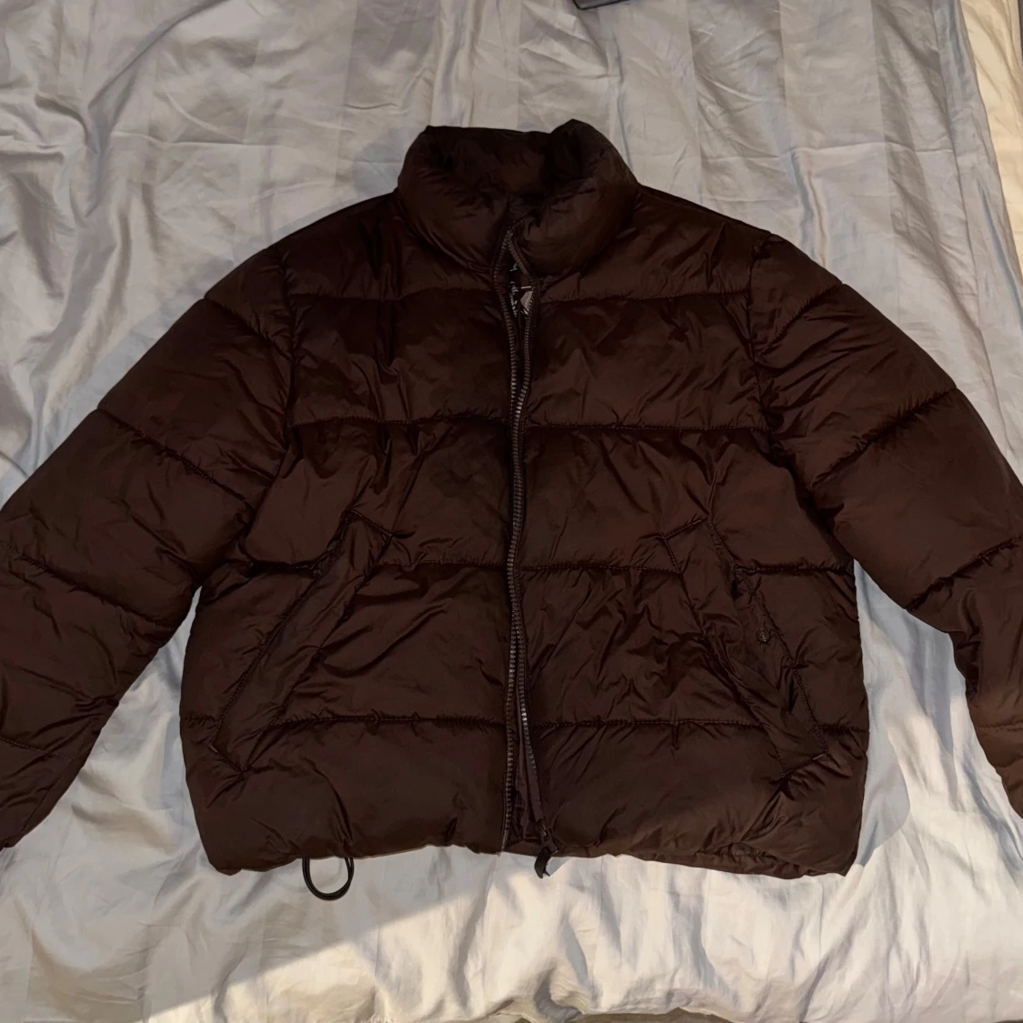 Säljer en brun pufferjacka med dragkedja. Jackan har en quiltad design och långa ärmar, perfekt för kyligare dagar. Den är både stilren och funktionell. Pufferjacka i storlek Large från HM