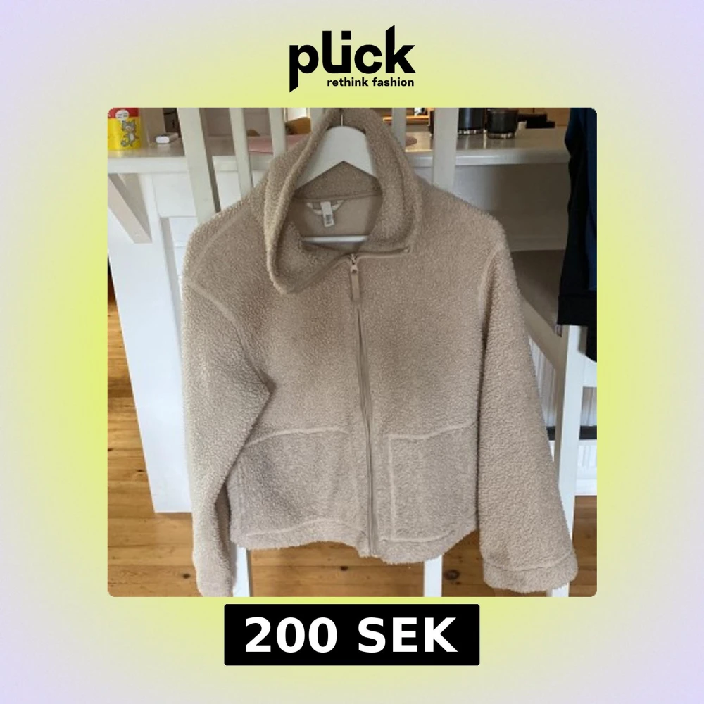 Mysig beige teddyjacka från H&M i storlek M. Jackan har hög krage, hel dragkedja framtill och två stora fickor. Perfekt för kyliga dagar och ger en chill vibe till din outfit.