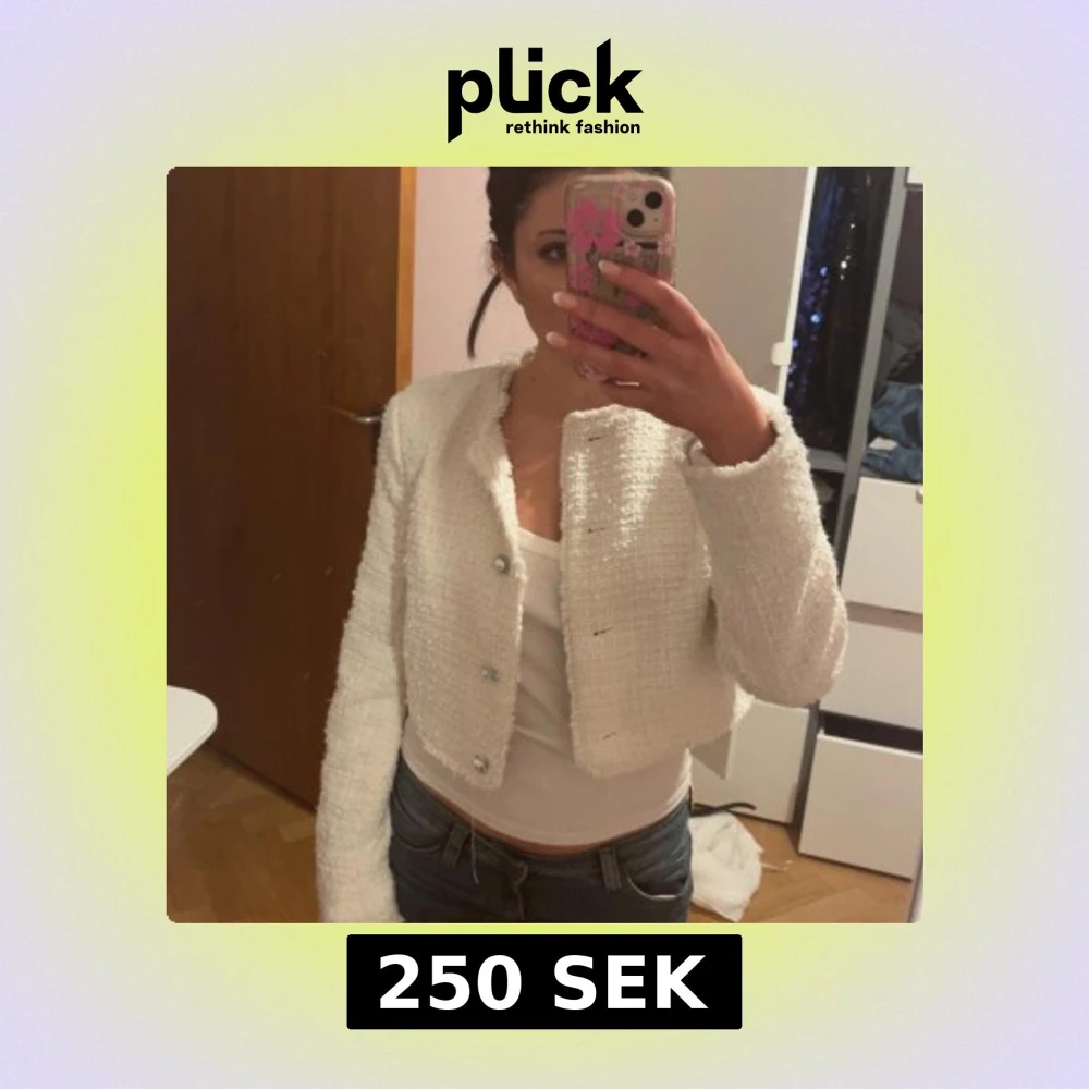 Säljer en stilren vit tweedjacka med knappar framtill. Jackan är croppad och har en klassisk look som passar perfekt för både vardag och fest. Den har långa ärmar och en elegant struktur som ger en lyxig känsla.