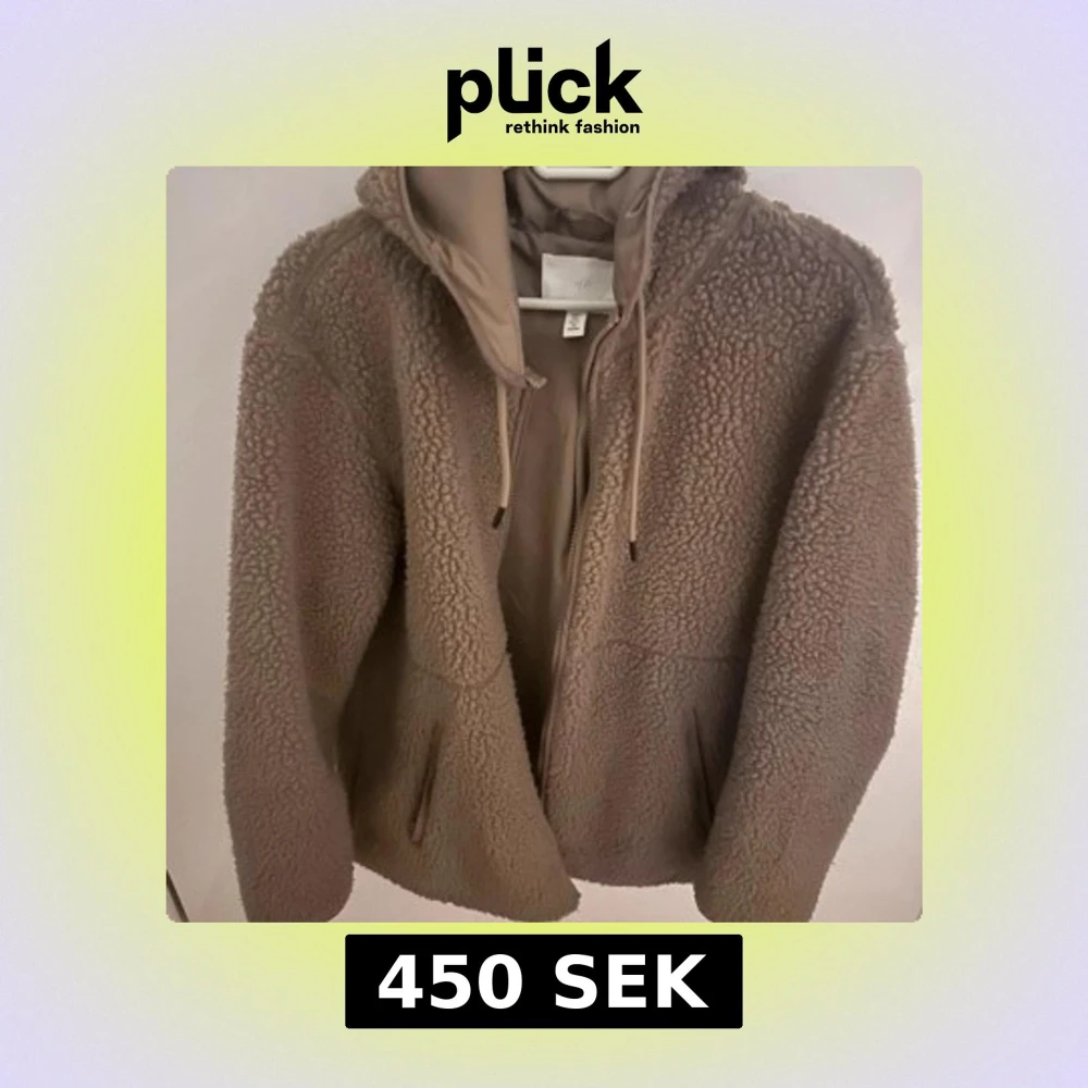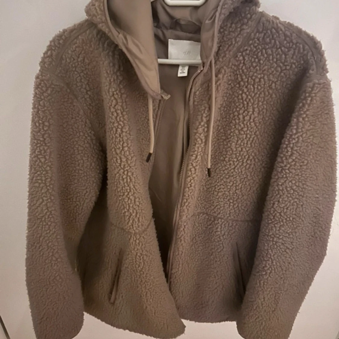 Mysig beige teddyjacka från H&M med huva och dragsko. Jackan har dragkedja framtill och två fickor på sidorna. Perfekt för kyliga dagar och ger en avslappnad vibe.