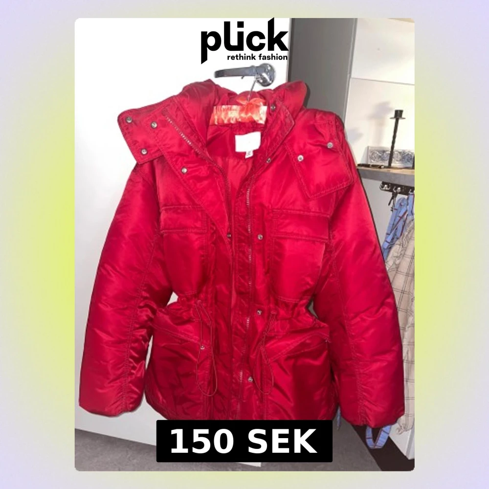 Säljer en röd pufferjacka med stor huva, snörning i midjan och flera praktiska fickor framtill. Jackan har dragkedja och tryckknappar, perfekt för kalla dagar. Materialet är glansigt och känns riktigt mjukt och skönt.