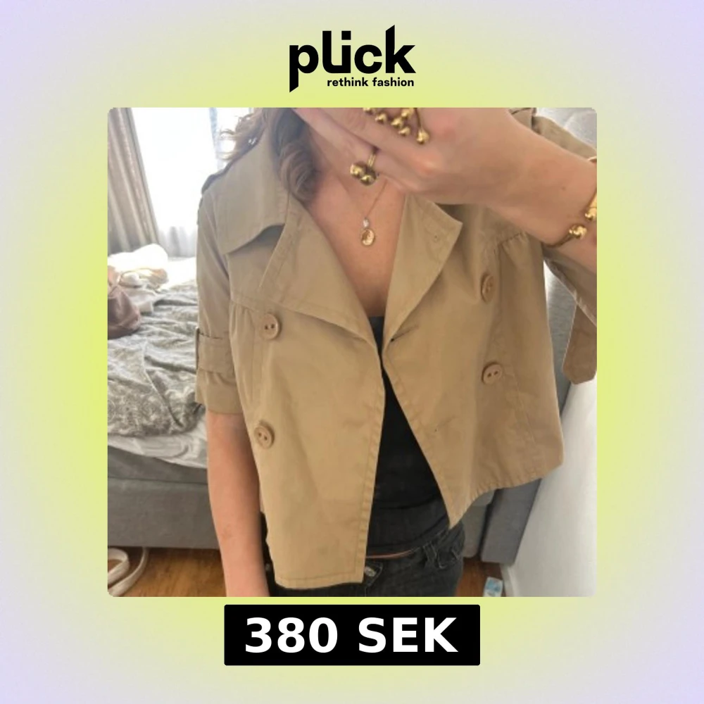 Snygg croppad trenchcoat i beige med dubbelknäppning och korta ärmar. Jackan har klassisk krage, axelklaffar och dekorativa knappar på ärmarna. Perfekt höst kappa. Från Hm. Hör gärna av er vid frågor 🫶