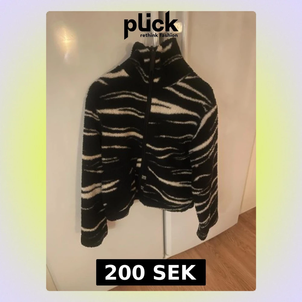 Mysig teddyjacka i svart med vitt zebramönster och hel dragkedja framtill. Jackan har hög krage och långärmad passform, perfekt för kyliga dagar. Materialet är fluffigt och ger en cool look.