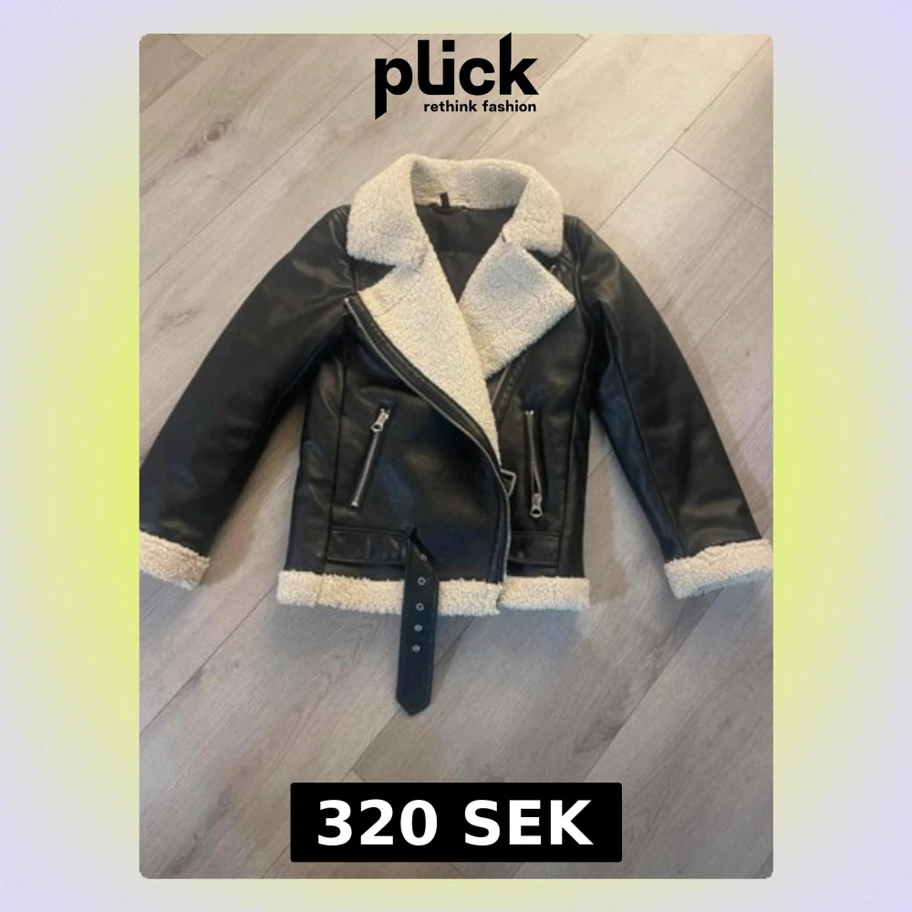 Säljer en svart skinnjacka med krämvit teddyfoder på krage, ärmslut och nederkant. Jackan har två snedställda dragkedjefickor, bälte i midjan och grov dragkedja framtill. Perfekt för dig som vill ha en cool och varm look i höst och vinter.