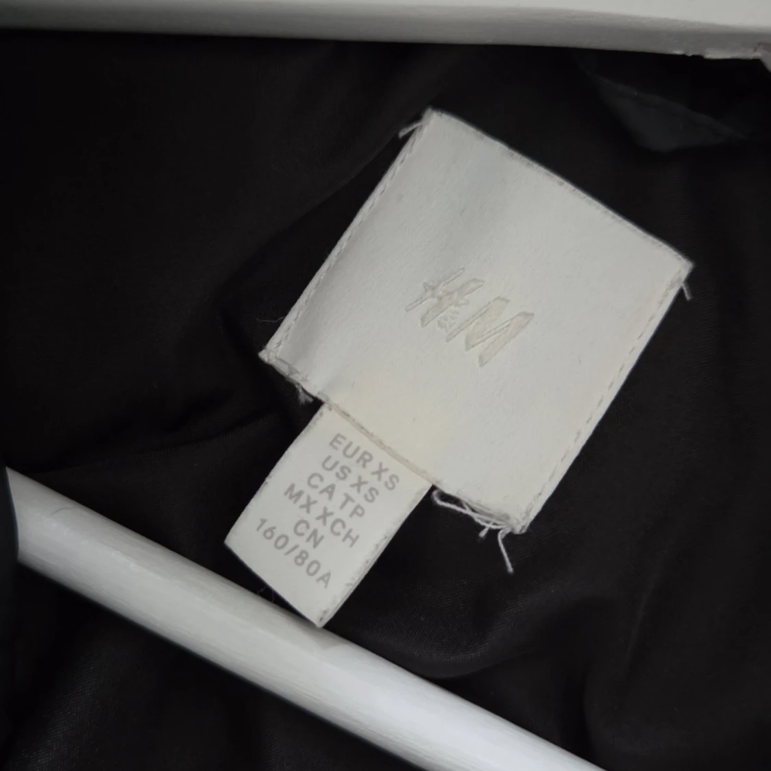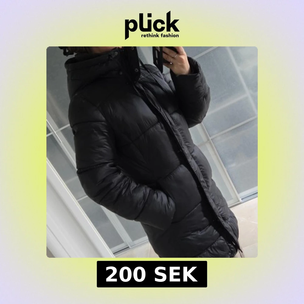 Svart lite glansig vinterjacka i storlek xs från H&M i fint skick.Längd fram 87cm & bak 94cm.Dragkedjan går att öppna både nertill och upptill.💕