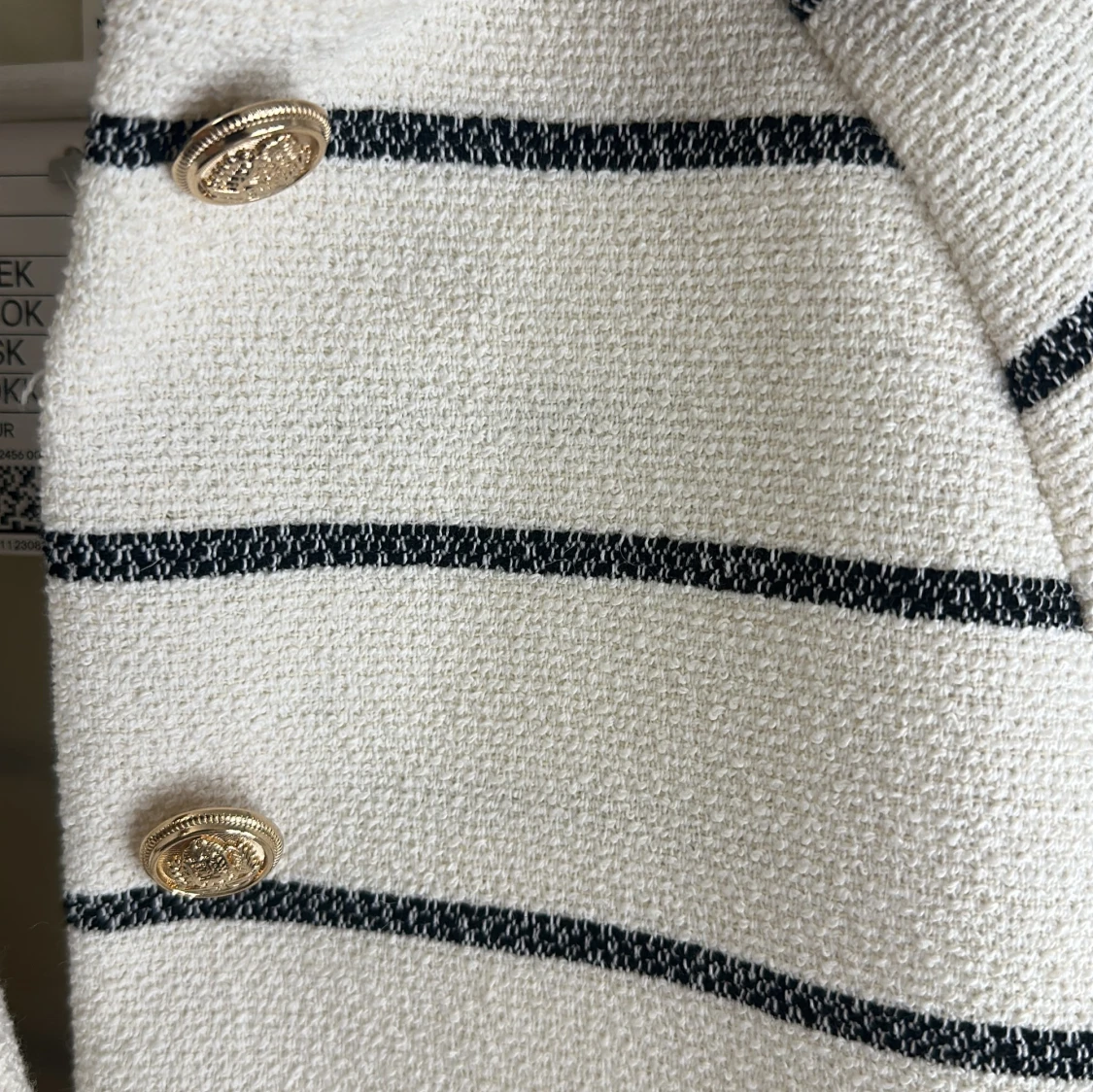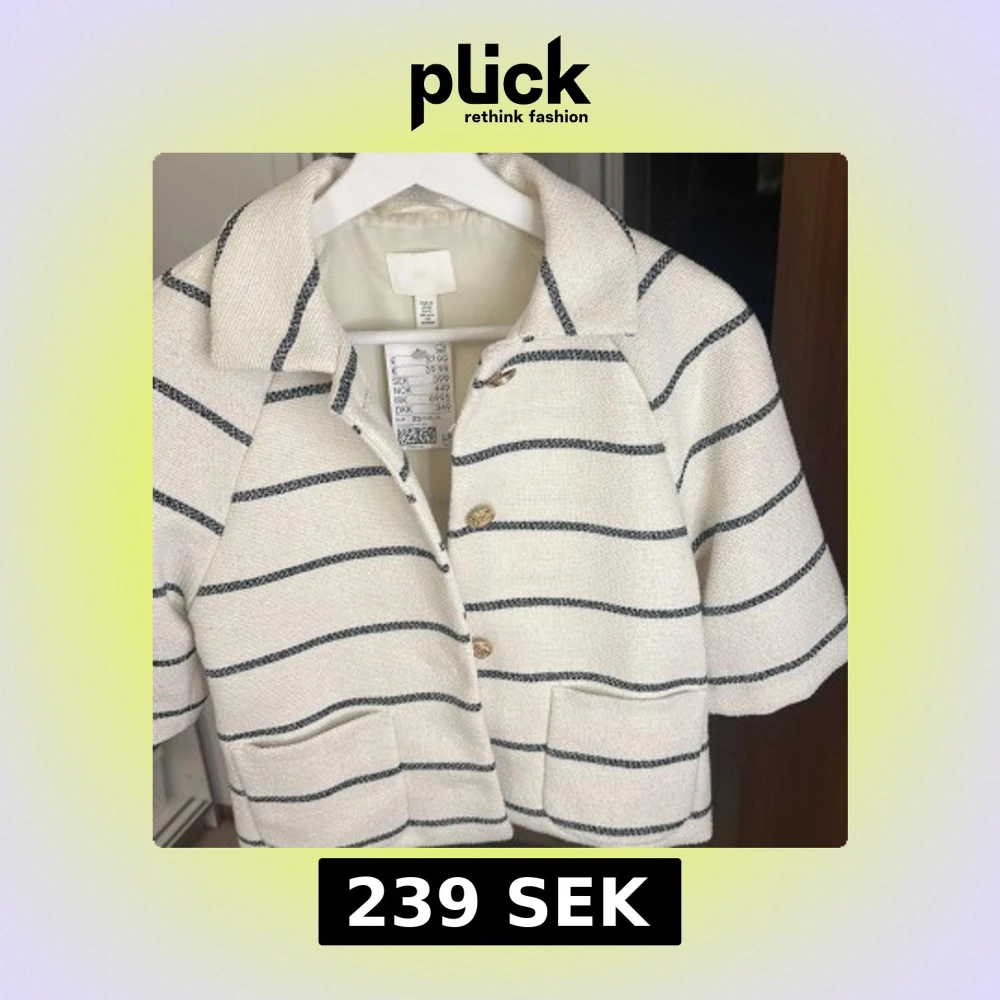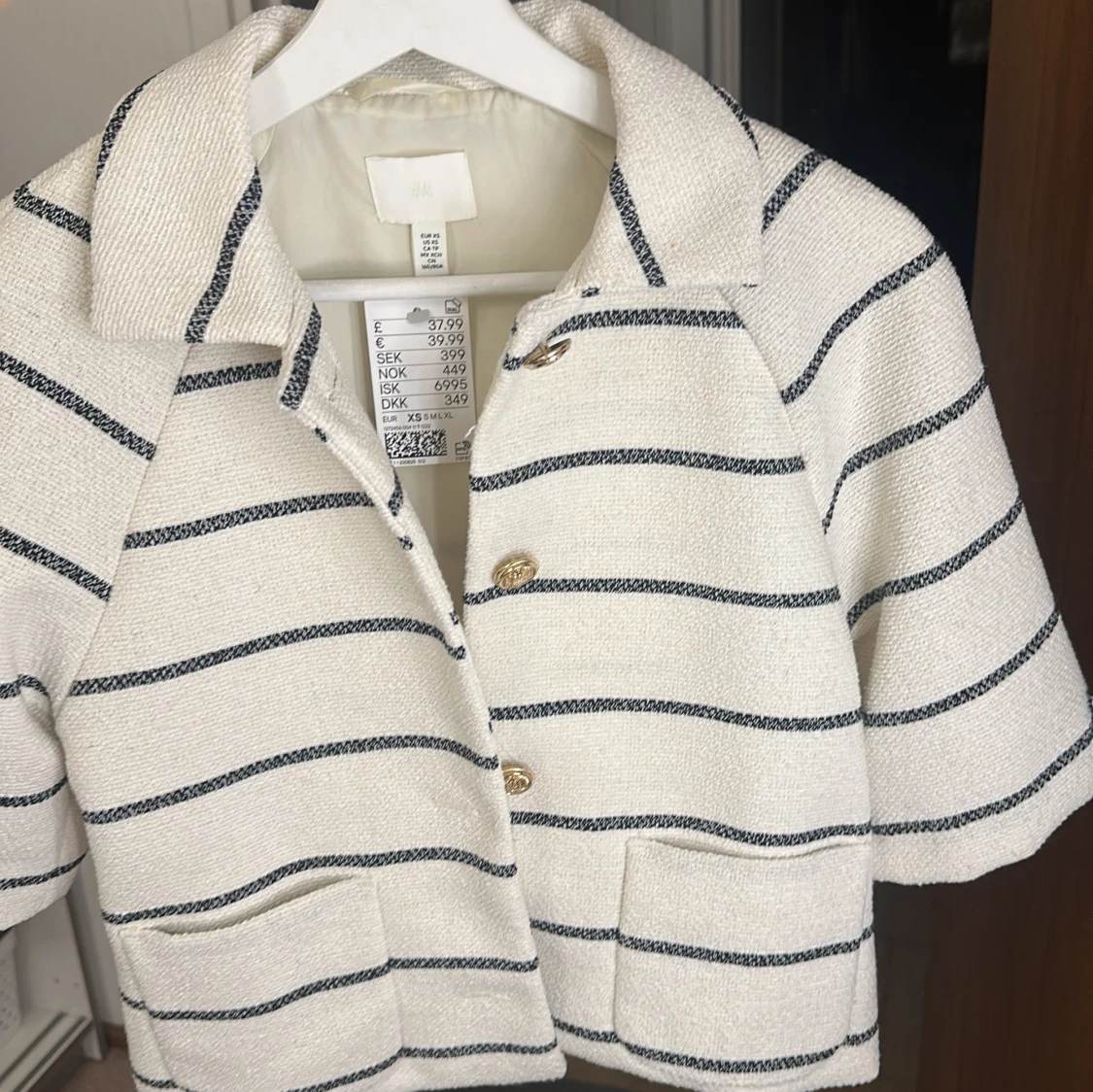 Säljer en snygg vit kavaj med svarta ränder från H&M. Jackan har korta ärmar, guldiga knappar framtill och två fickor. Den är tillverkad i ett strukturerat tyg som känns lyxigt och har en klassisk krage. Perfekt för att lyfta din outfit.