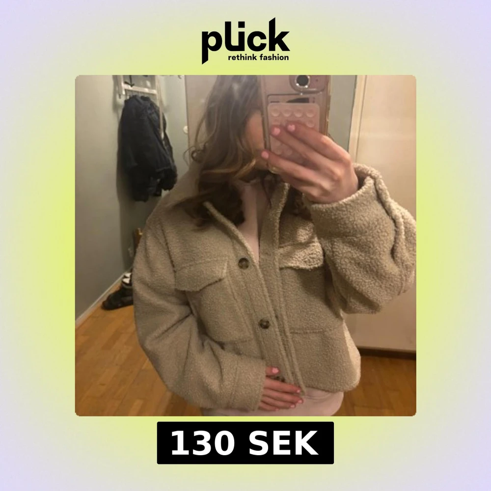 Mysig beige teddyjacka med knappar framtill och två bröstfickor. Perfekt för kyliga dagar och ger en trendig look. Jackan har en croppad passform och långa ärmar.