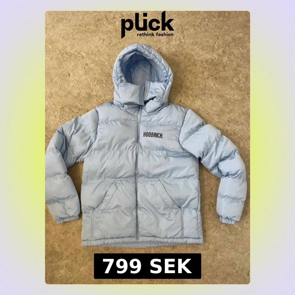 Säljer en ljusblå pufferjacka från Hoodrich med stor huva och dragkedja framtill. Jackan har broderad logga på bröstet och ryggen, samt två stora fickor framtill. Perfekt för kalla dagar och har en riktigt chill vibe.