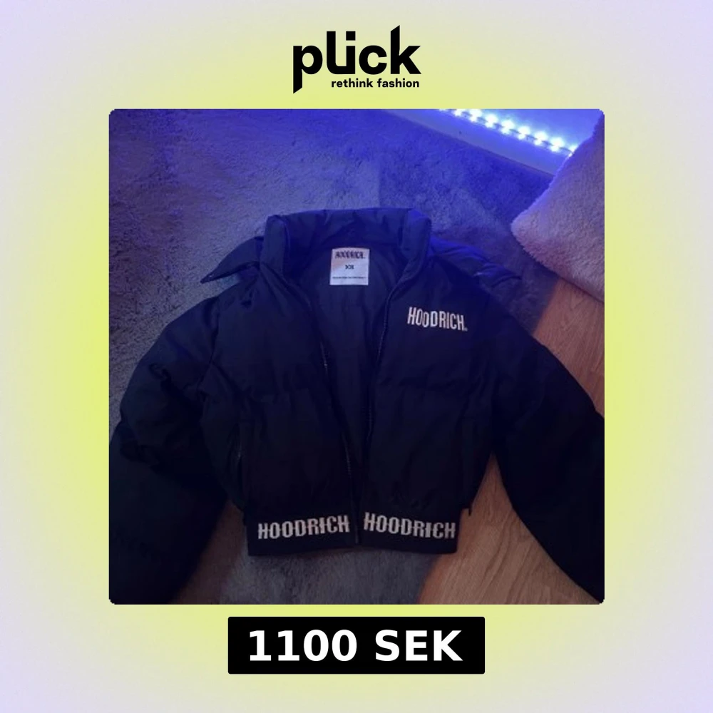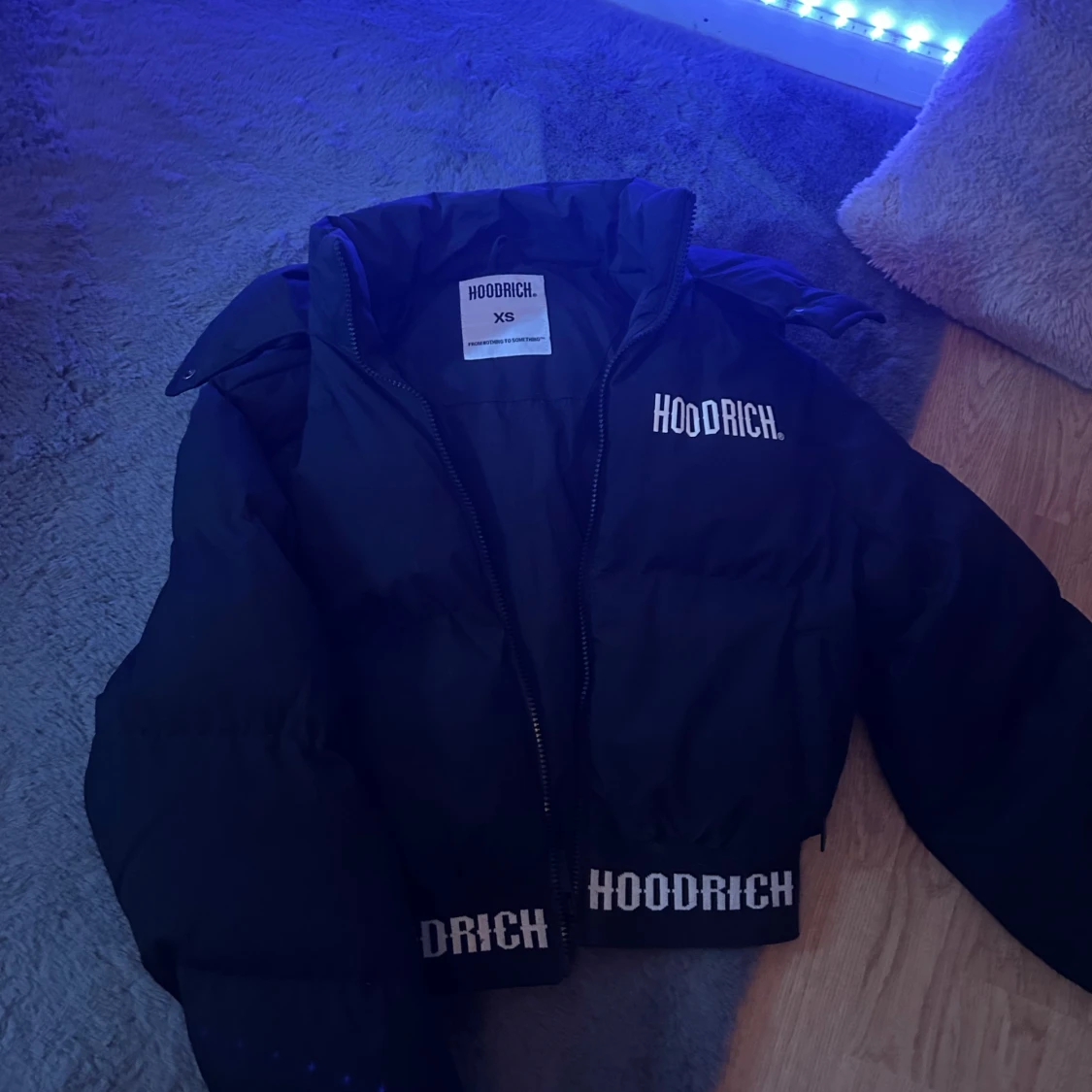 Svart pufferjacka från Hoodrich i storlek XS. Jackan har en croppad passform, dragkedja framtill och tydliga vita Hoodrich-loggor på bröstet och längs nederkanten. Perfekt för dig som vill ha en streetstyle-look med attityd.