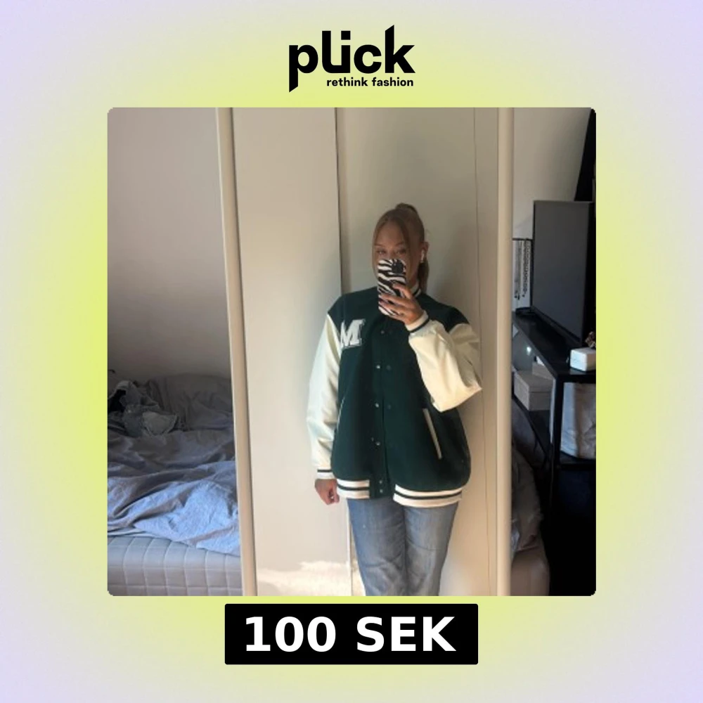 Säljer en snygg bomberjacka i college-stil. Jackan är mörkgrön med vita ärmar och detaljer, broderad text och stor M på bröstet. Klassisk randig mudd vid ärmslut och nederkant. Perfekt för dig som vill ha en sportig och trendig look.