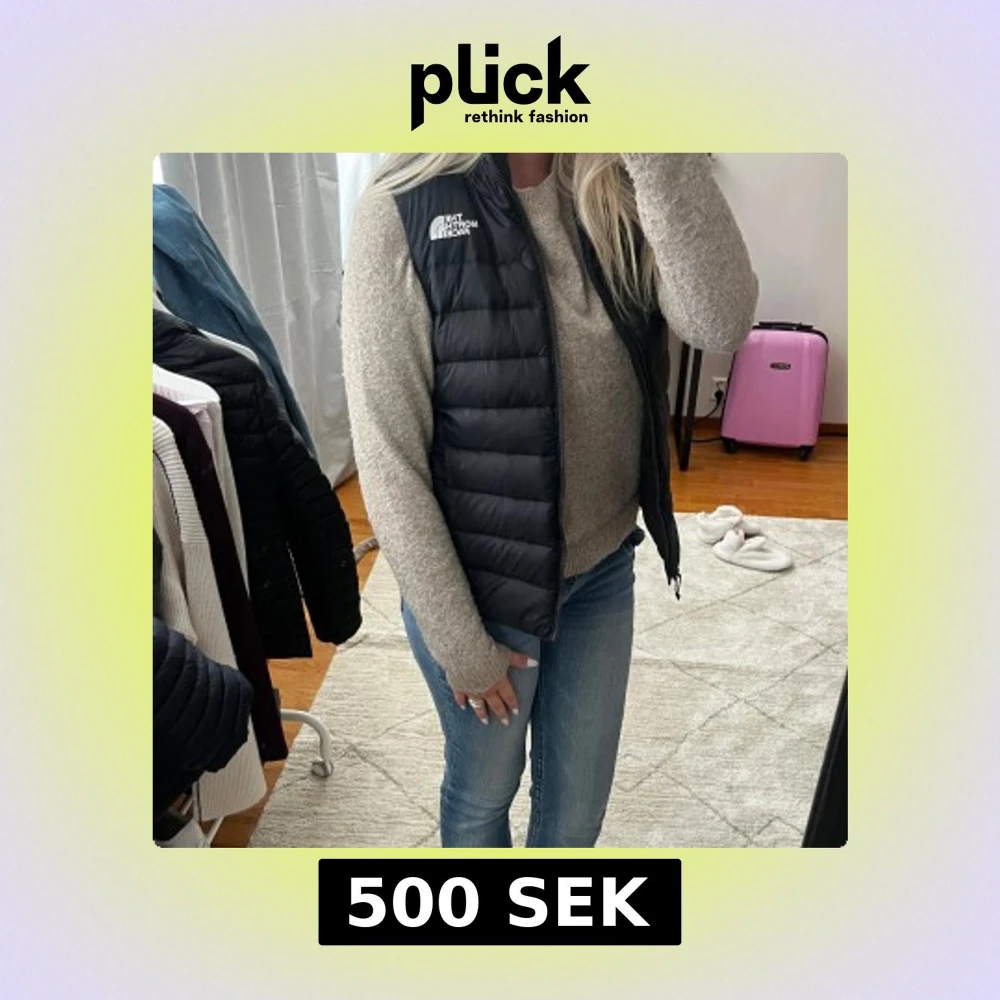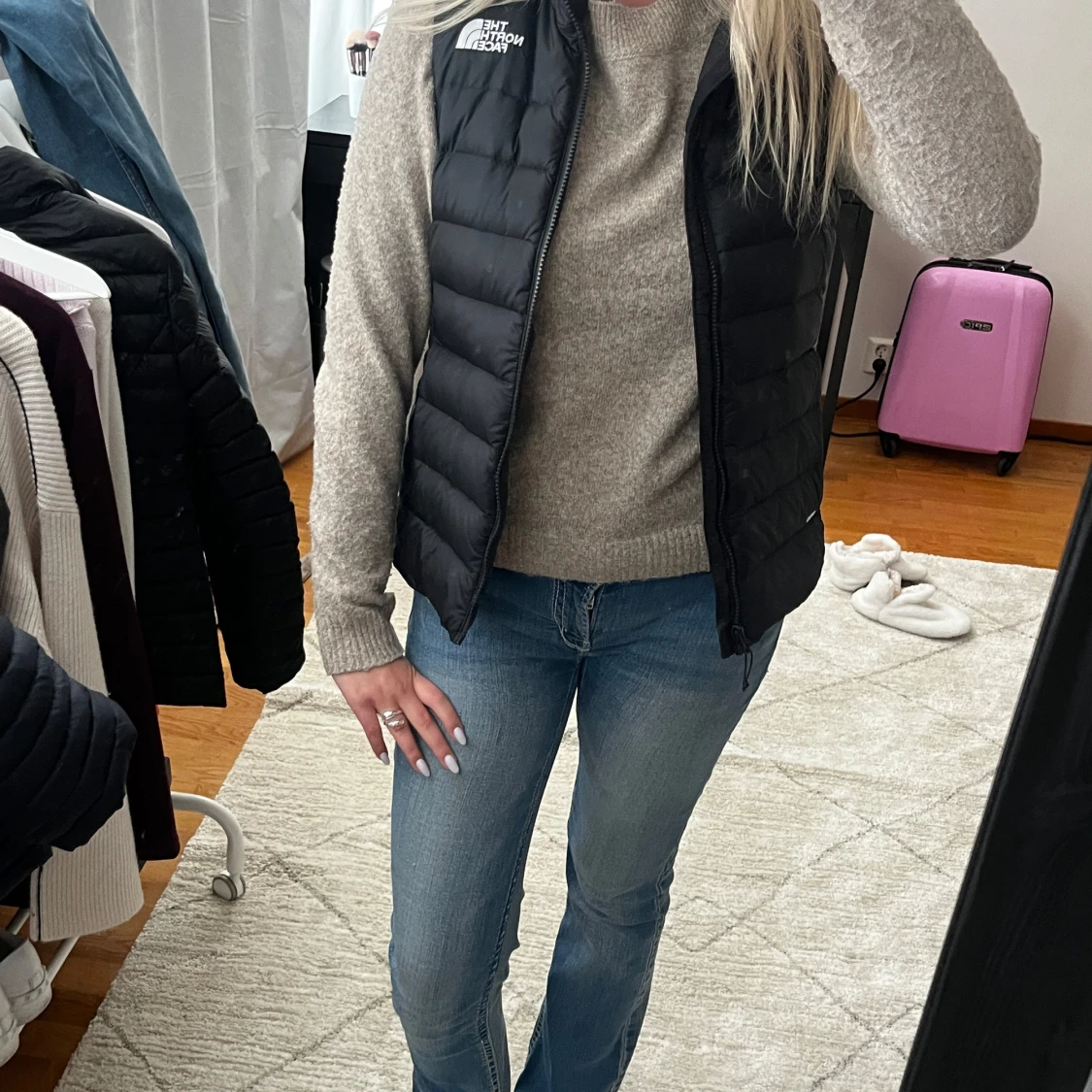 Säljer en svart dunväst från The North Face med quiltad design och logga på bröstet. Västen har en klassisk, rak passform och dragkedja framtill. Perfekt att slänga över en hoodie eller stickad tröja för extra värme. Enkel och stilren look.