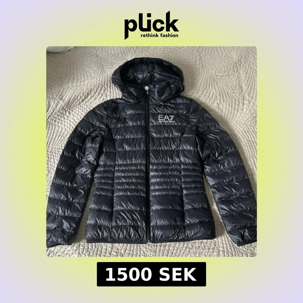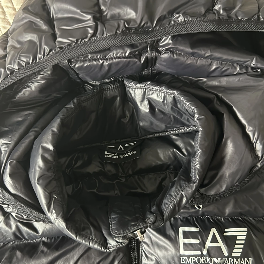 Snygg svart dunjacka från EA7 Emporio Armani med huva och dragkedja framtill. Jackan har ett stilrent, quiltat mönster och logga på bröstet. Tillverkad i polyester och perfekt för kyliga dagar. Klassisk passform och långärmad modell. Pris 1500kr, ordinarie 2000kr