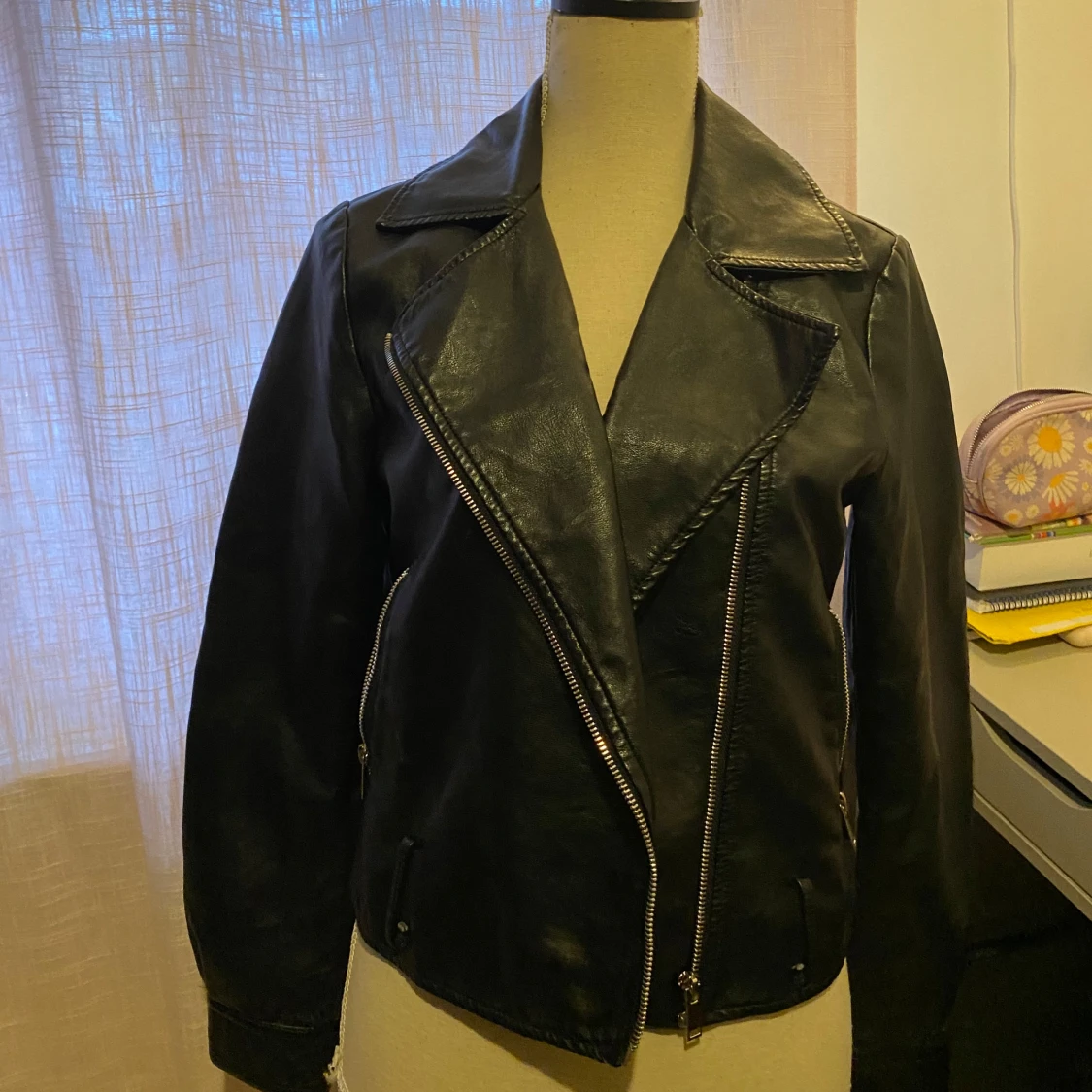 Snygg svart skinnjacka med asymmetrisk dragkedja och klassisk krage. Jackan har långa ärmar och två fickor med dragkedjor. Kommer med bälte. Har fläckar av väggmålarfärg på men ej så synligt så pris kan diskuteras🤍