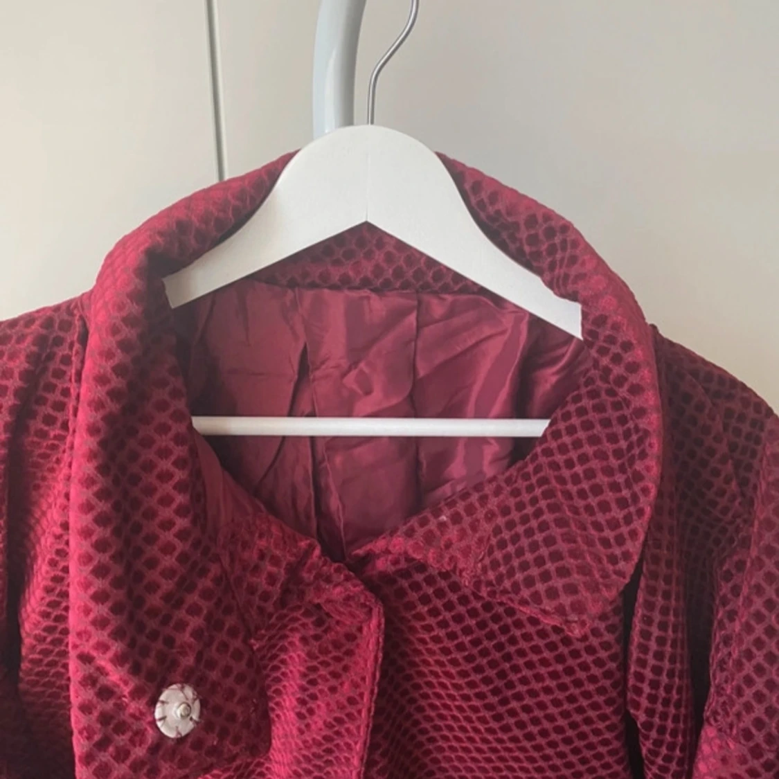 Vinröd höstkappa köpt secondhand för 350kr inget märke misstänker att den är hemmagjord.