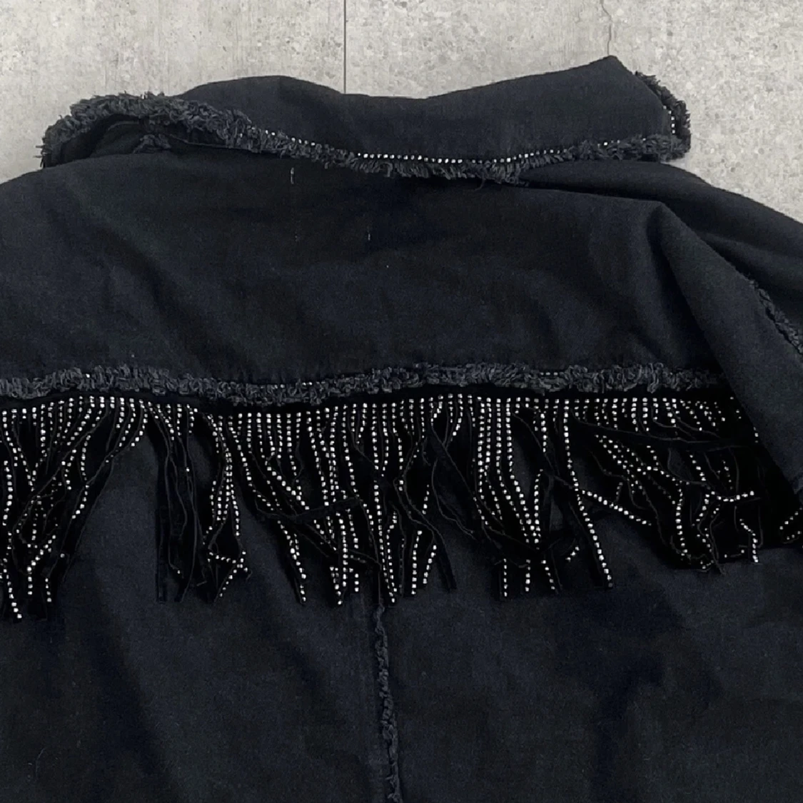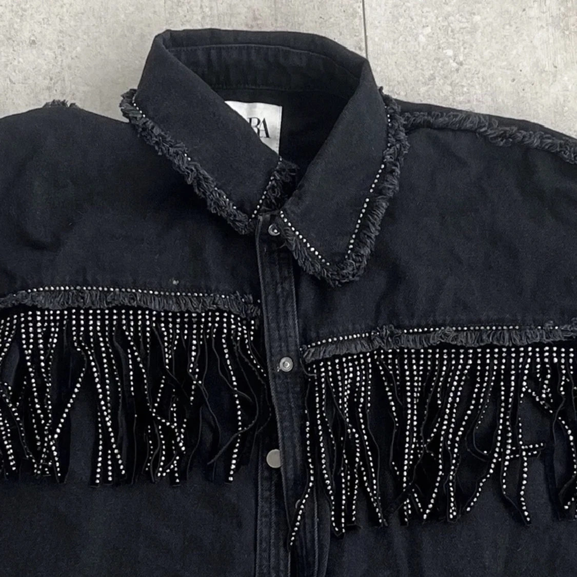 Intressekoll på den här asballa jackan från Zara! Säljs inte längre 💕Jeansliknande tyg och glitterfransar fram och bak ❤️🔥Skriv för fler bilder!