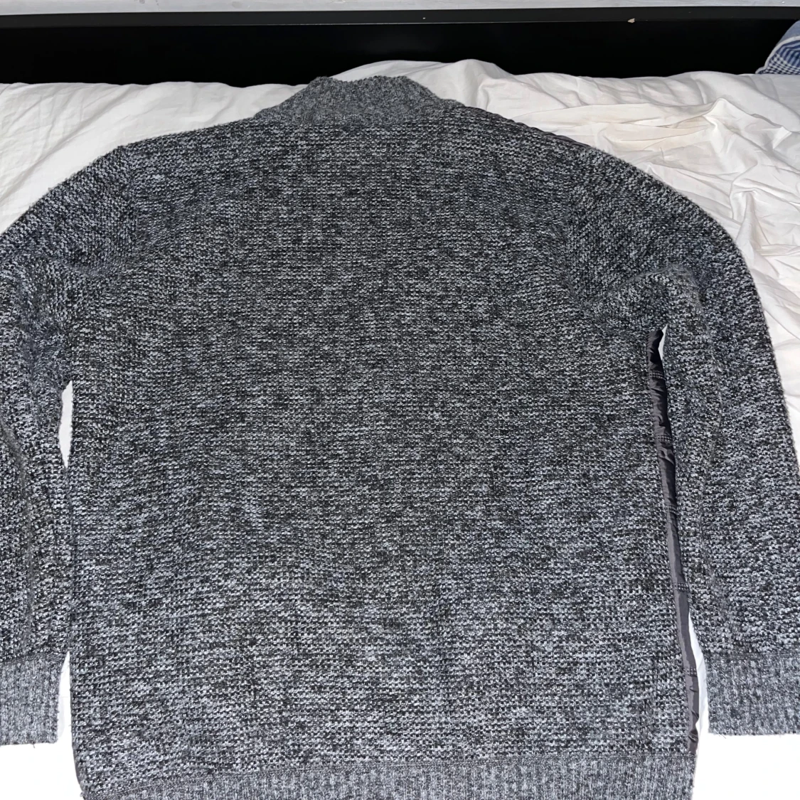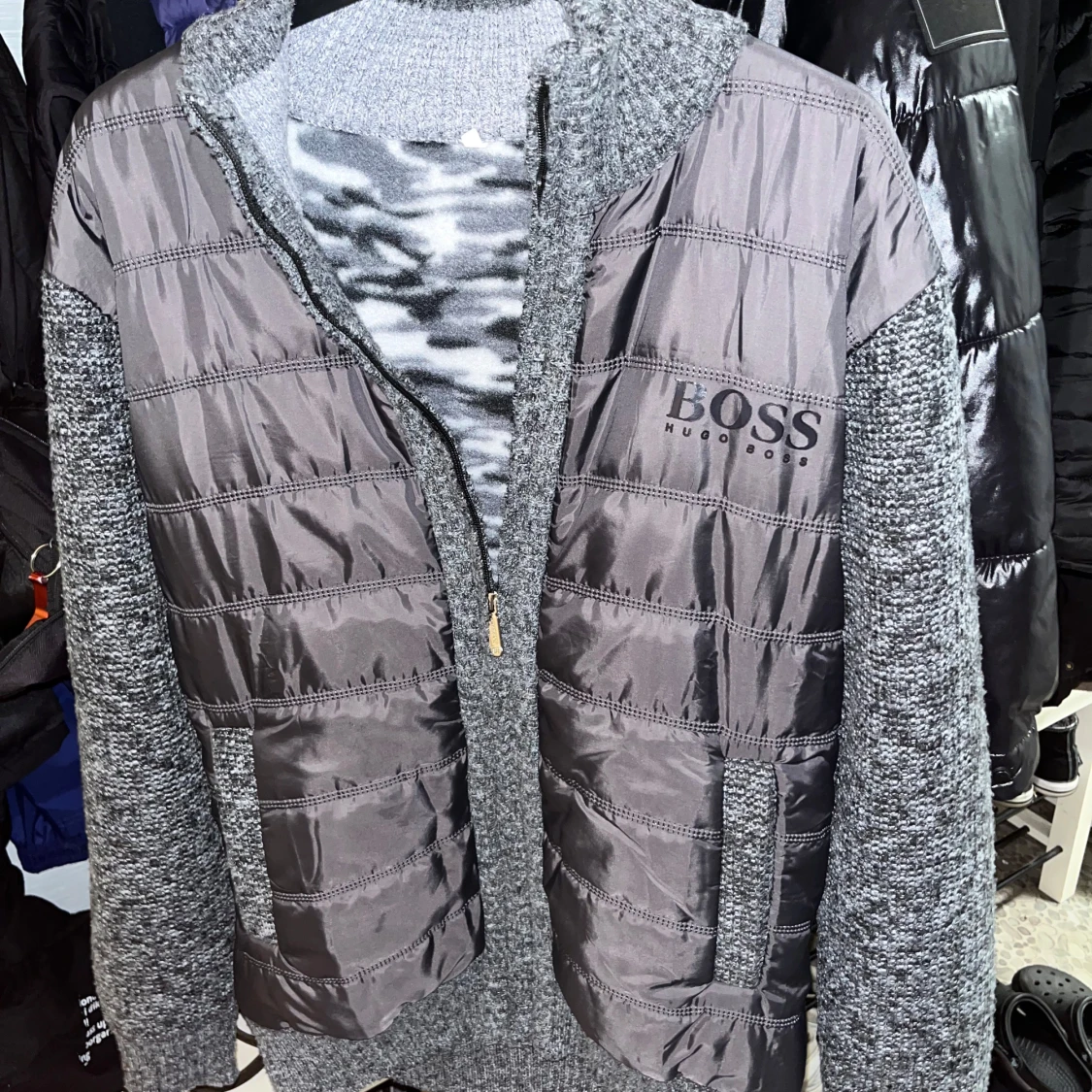Snygg grå cardigan från Hugo Boss med quiltade detaljer och dragkedja. Jackan har en mix av material med stickade ärmar och rygg, samt ett mönstrat foder. Perfekt för kyligare dagar. Storlek XL men känns som M-L