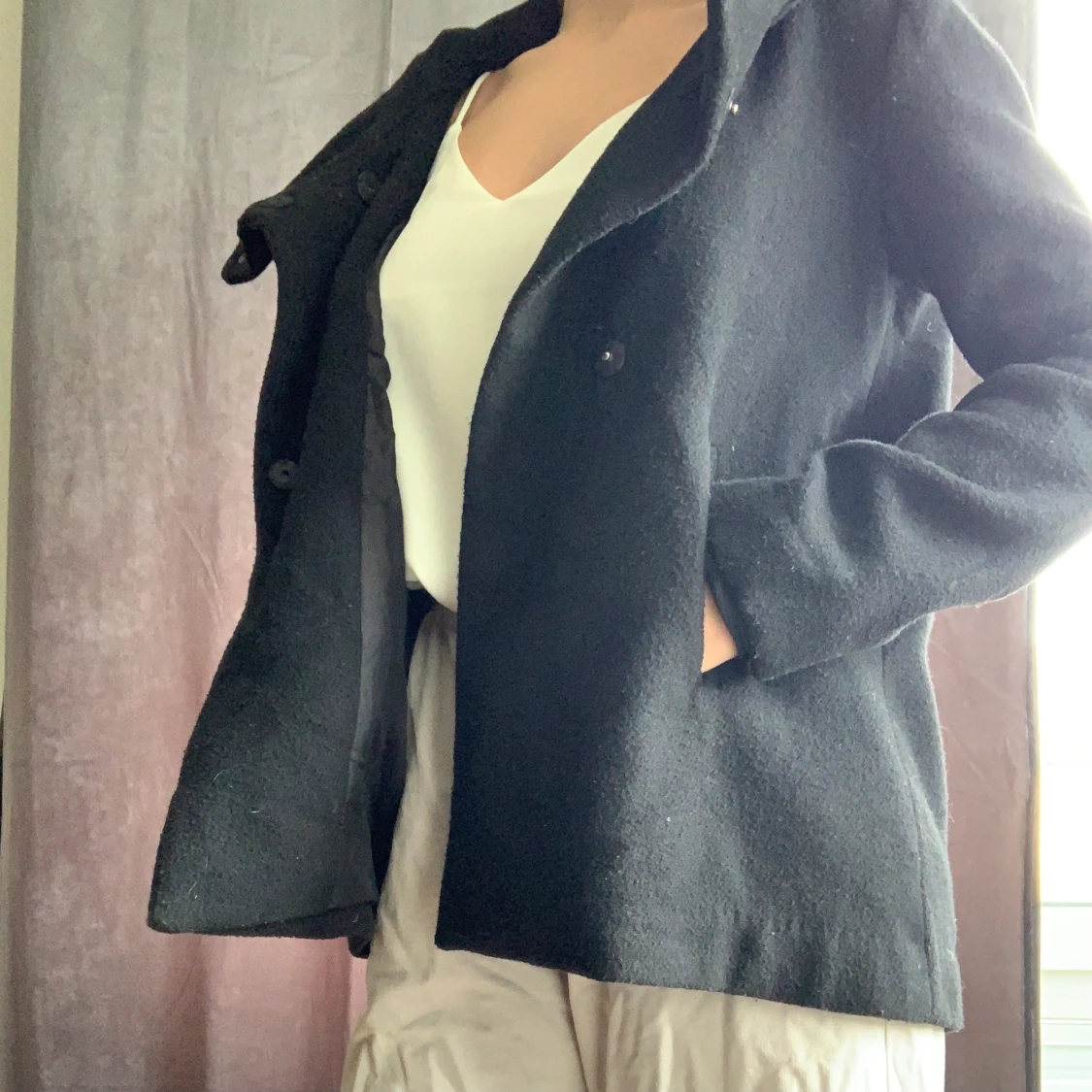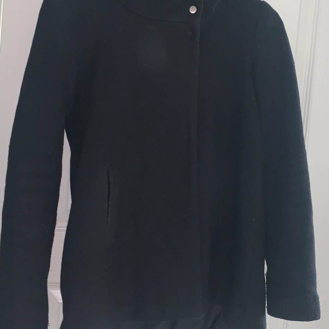 En svart kappa ifrån JACQUELINE DE YONG i storlek XS. Kappan har knäpp-stängning och hög krage. Använd under en säsong och är som gott i nytt skick, förutom ett hål i innerfickan men är inget som påverkar användningen av jackan eller är synligt.