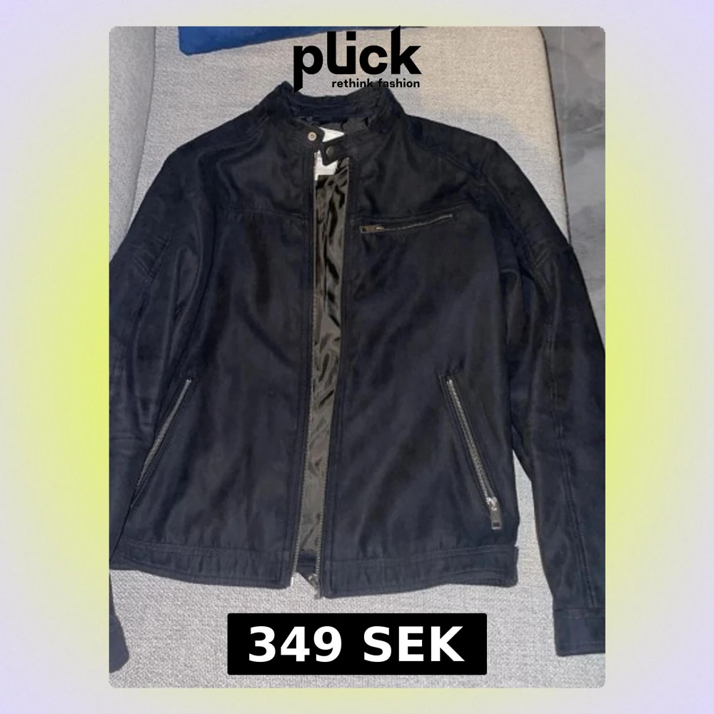 Snygg mörkblå jacka med ståkrage och flera dragkedjor, inklusive två snedställda fickor och en bröstficka. Jackan har en stilren look och passar perfekt till både jeans och sneakers. Fodrad insida för extra komfort.