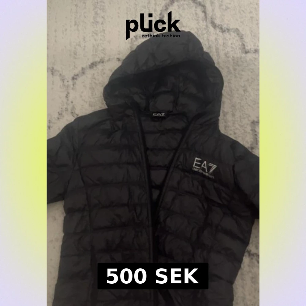 Svart pufferjacka från EA7 Emporio Armani med huva och dragkedja. Jackan har quiltad design och logga på bröstet. Säljer för att jag gillar inte den stilen längre! Inga defekter eller något liknande