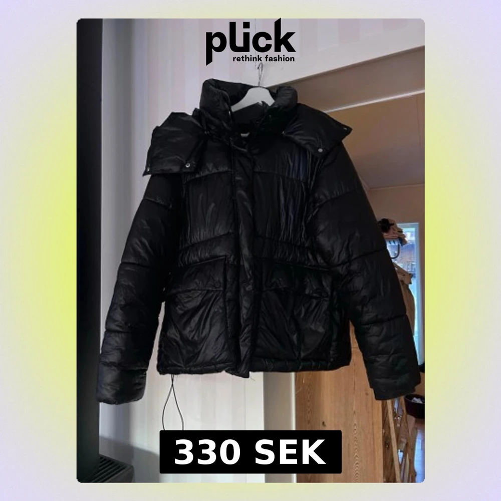 Säljer en svart pufferjacka med hög krage och stora fickor framtill. Jackan har både dragkedja och tryckknappar, samt en quiltad design som ger extra volym. Materialet är glansigt och känns syntetiskt, perfekt för kalla dagar. Fint skick!!