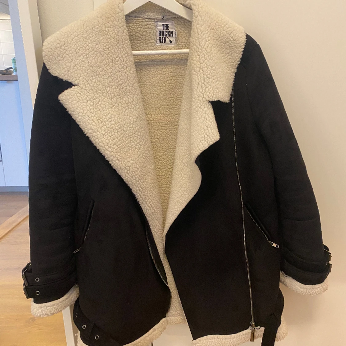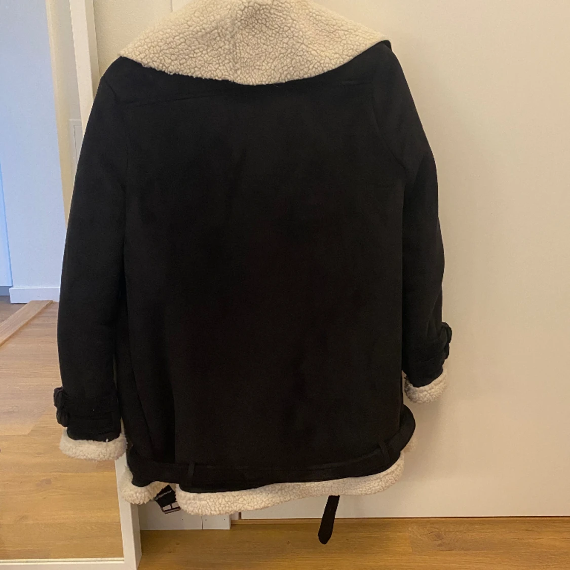 Oversized jacka i mockaimitation med teddymaterial på insidan. Spännen på vardera ärm samt längst ner. Endast använd ett fåtal gånger.