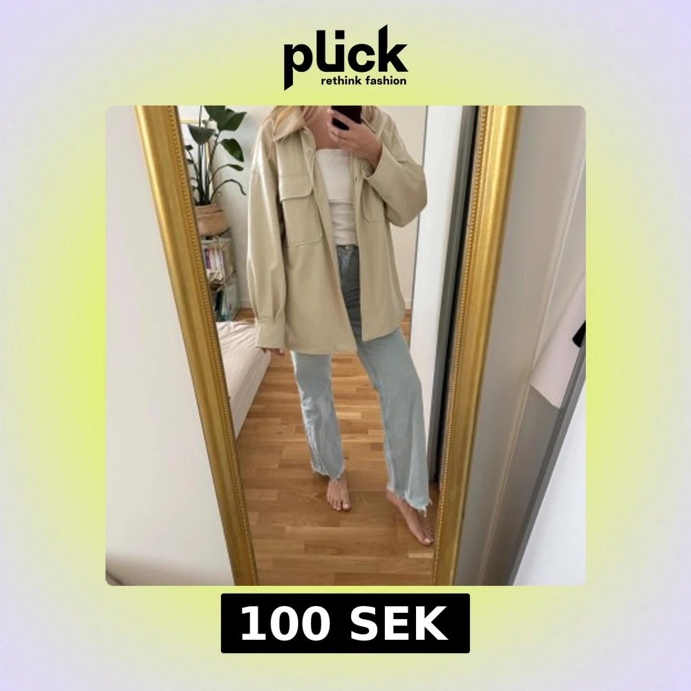 Säljer en oversized beige overshirt i skinnimitation med stora bröstfickor och knäppning framtill. Jackan har klassisk krage och långa ärmar med breda manschetter. Perfekt för lager-på-lager och ger en clean look till jeans eller kjol.