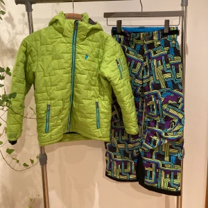Matchande täckbyxa, dunjacka och vantar för barn från Peak Performance. Jackan har två fickor med dragkedja framtill samt en innerficka. Luvan är avtagbar. Byxorna har två fickor med dragkedja framtill samt två baktill och två på varsitt knä som stängs med kardborre. Allt är i fint skick! Strl i jacka och byxa : 140 Strl i vantar : 5