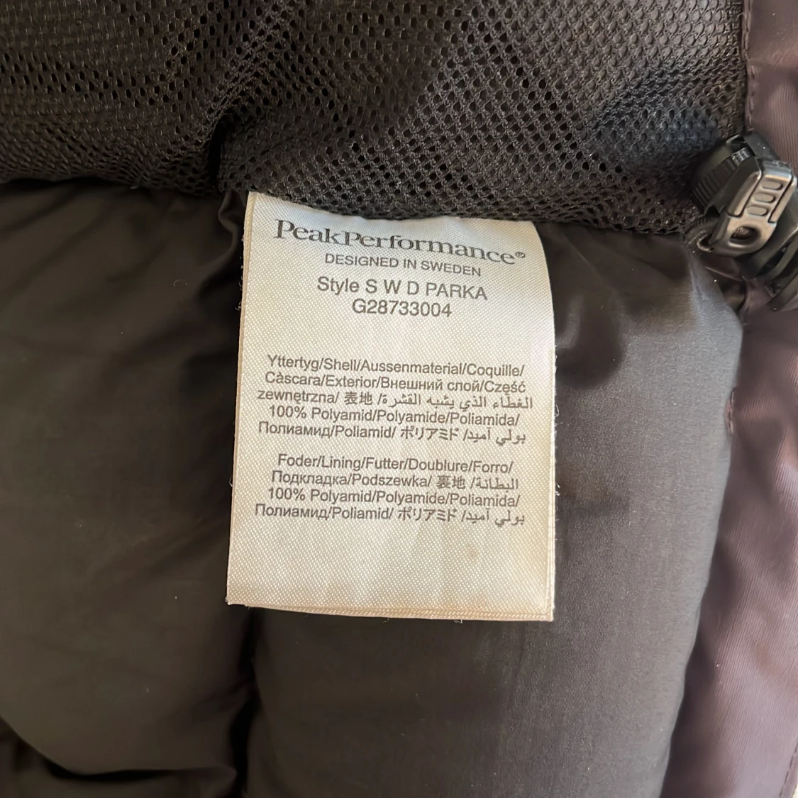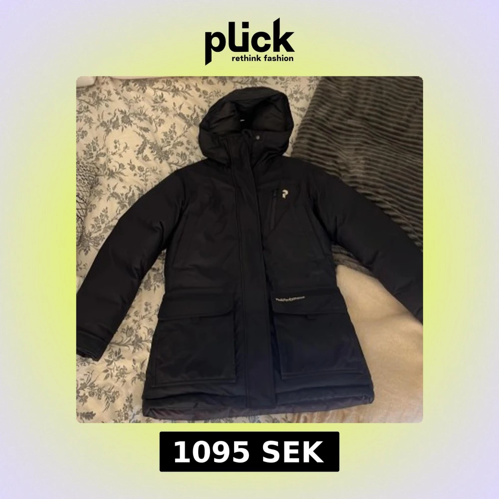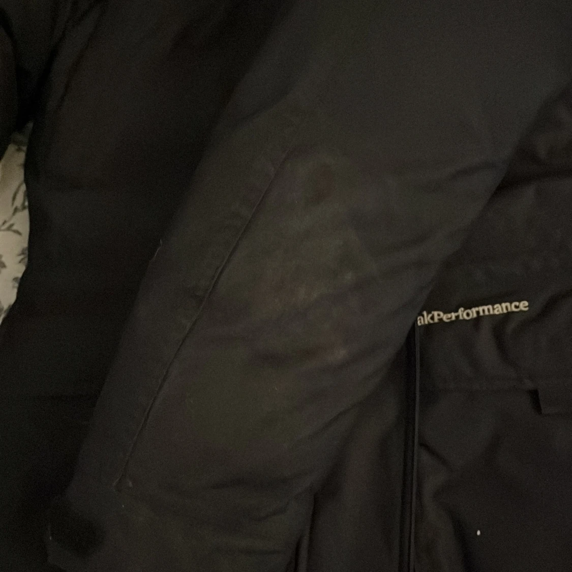 Svart parkas från Peak Performance med huva, stora fickor och dragkedja framtill. Jackan är vadderad och har en clean look med diskreta loggor. Materialet är polyamid och insidan har röda detaljer. Perfekt för kalla dagar när du vill hålla stilen. På sista bilden finns en liten fläck vid underarmen och även på andra sidan men inget man tänker på, därav priset lägre än ursprungliga pris! Använd fåtal gånger💕