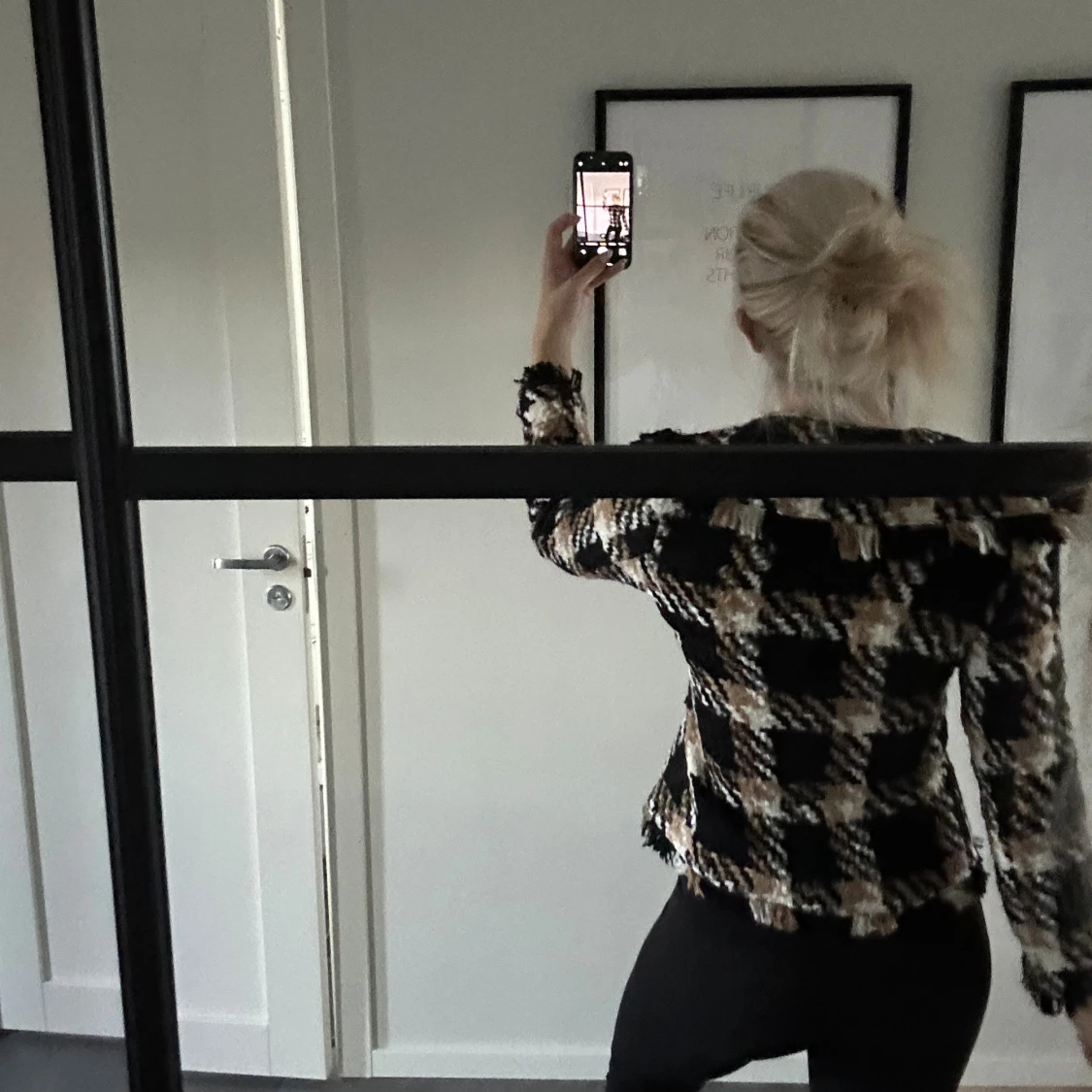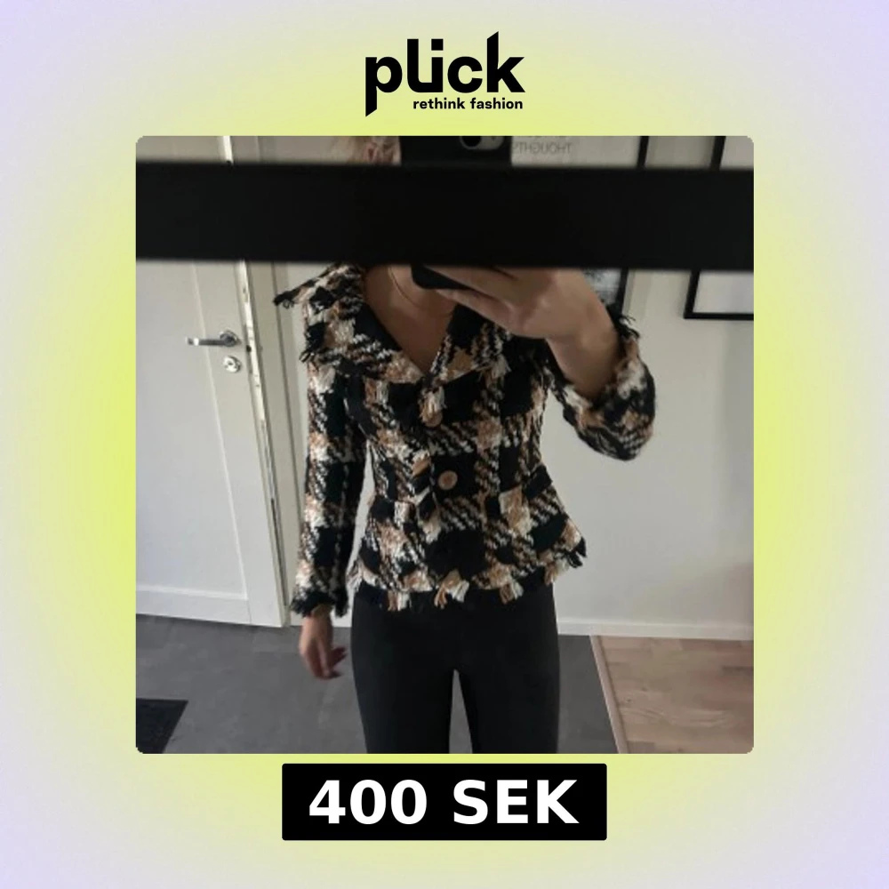 Säljer en snygg rutig kavajjacka från Bandolera i svart, beige och vitt. Jackan har markerad midja, stora knappar framtill, fransiga kanter och bred krage. Storlek 36 och bra skick.