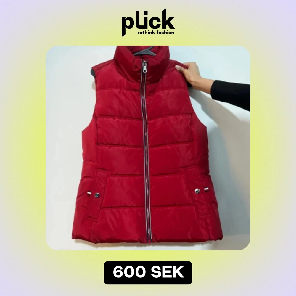 En röd dunväst från Tommy Hilfiger med dragkedja framtill och två fickor med knappar. Västen har en hög krage och är i storlek S.