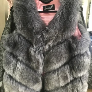 En grå pälsväst med svarta skinn detaljer (ej äkta skinn) i nyskick! Dottern använde den 1 gång. Köparen står för spårbar frakt med PostNord 66kr.