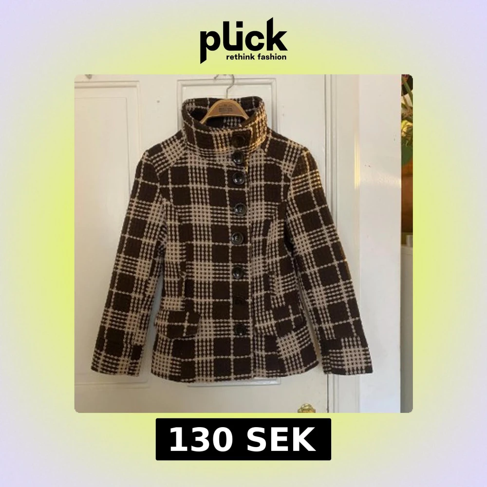 Jättesnygg brun och beige rutig jacka. Skärpet går att ta bort.