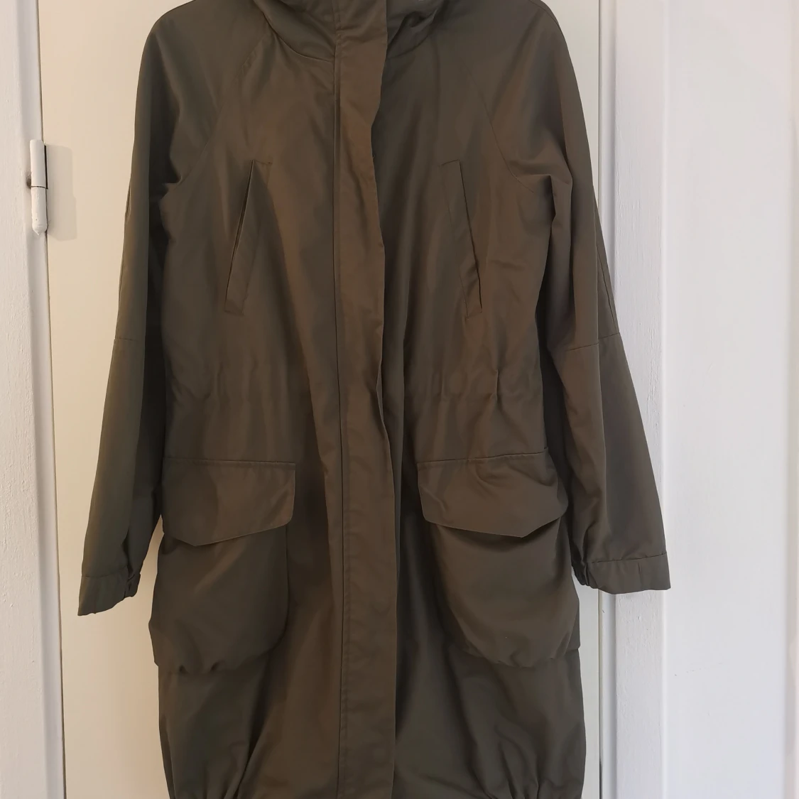 I kragen finns det en luva och jackan är i tunt vattenavstötande material. Lite trög i dragkedjan ibland men den funkar.