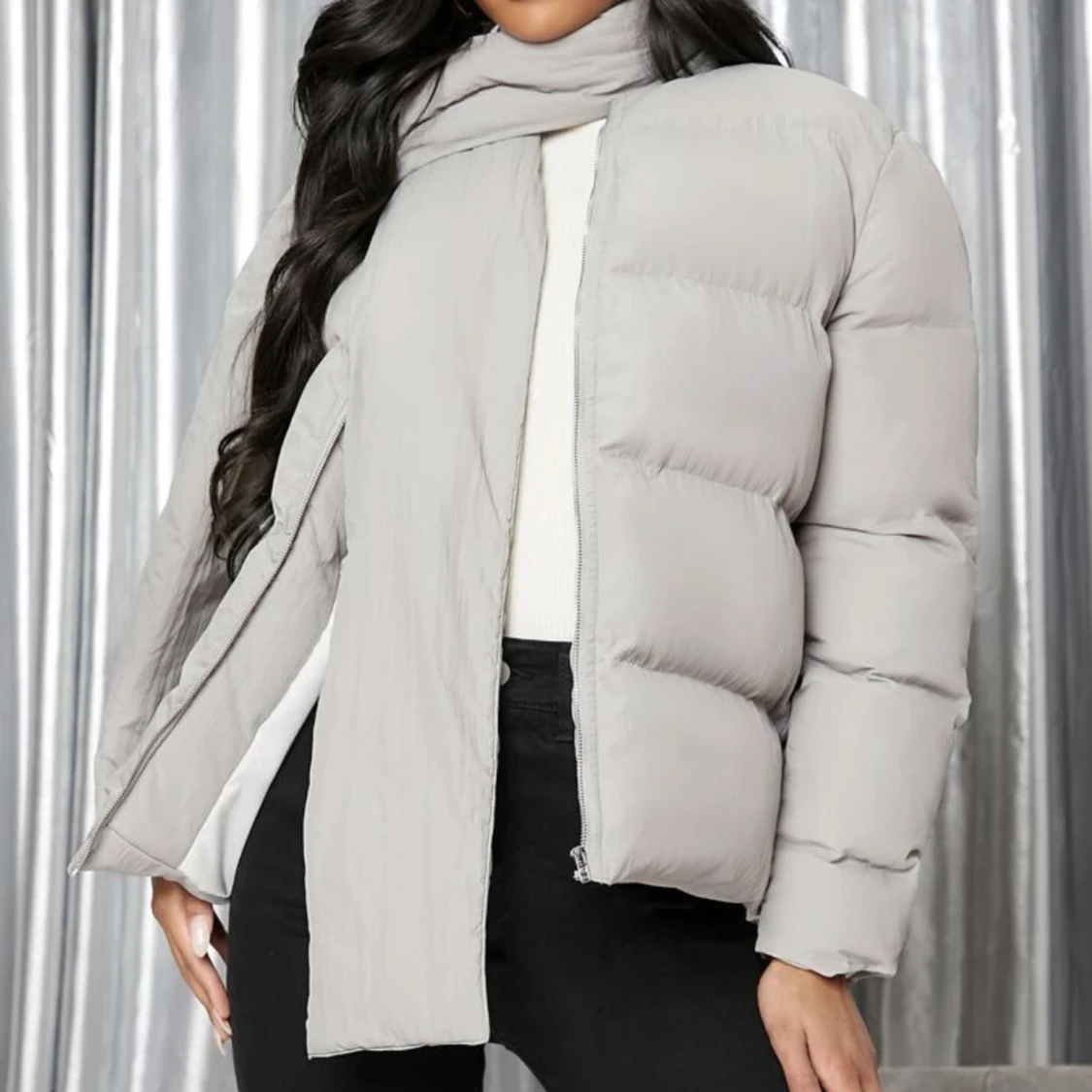 Grå vinterjacka med matchande halsduk! Köpt i vintras och är helt oanvänd pga fel storlek.